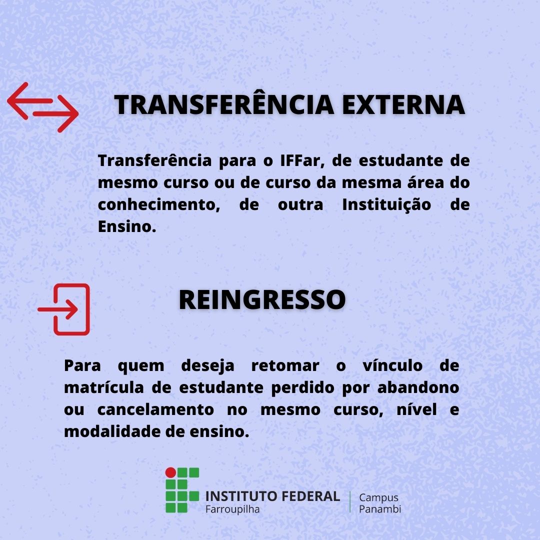 Transferência externa: para estudantes de outras instituições que queiram ingressar no IFFar no mesmo curso ou em curso da mesma área do conhecimento;