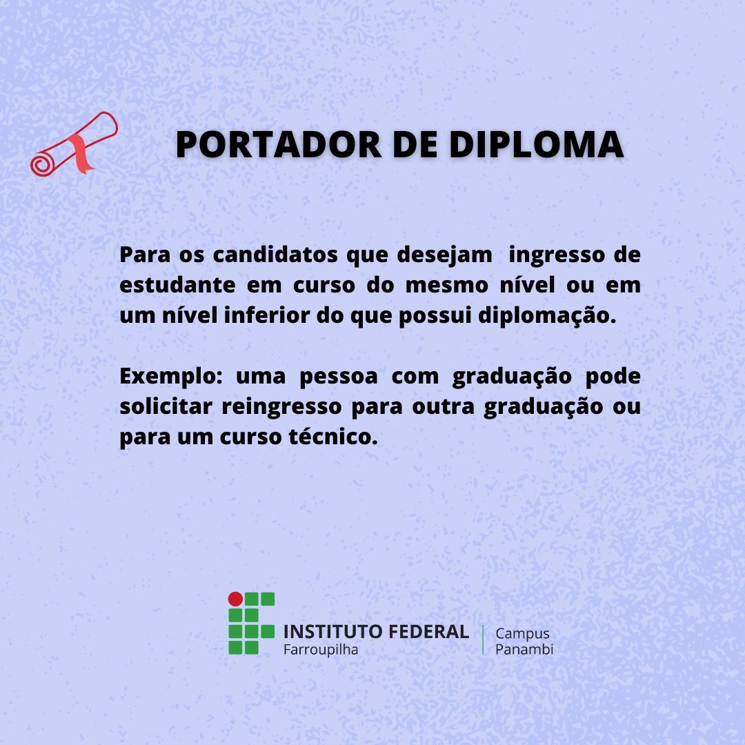 Portador de Diploma: ingresso de estudante em curso do mesmo nível ou em um nível inferior do que possui diplomação.