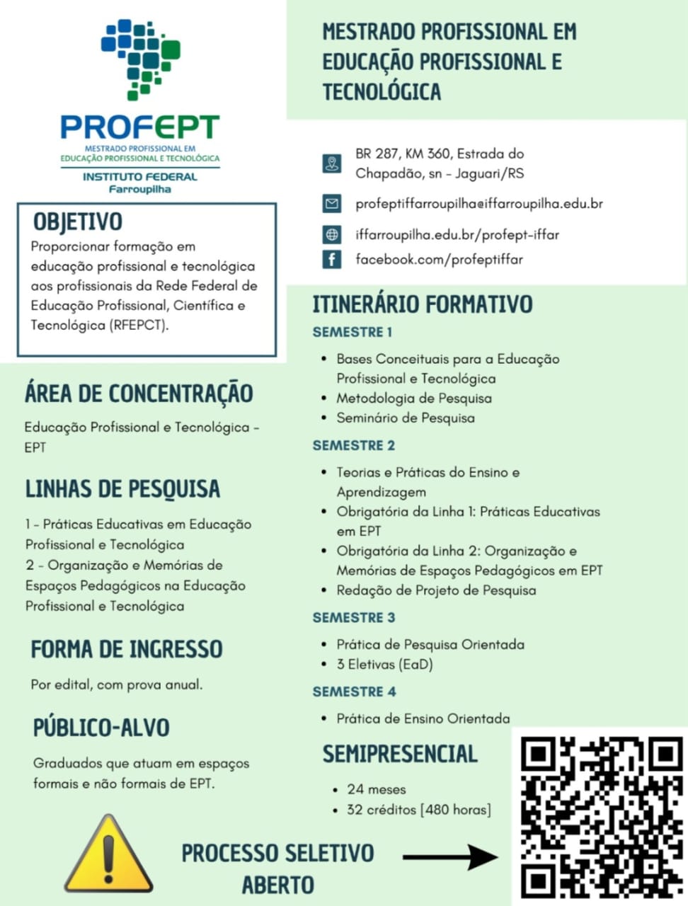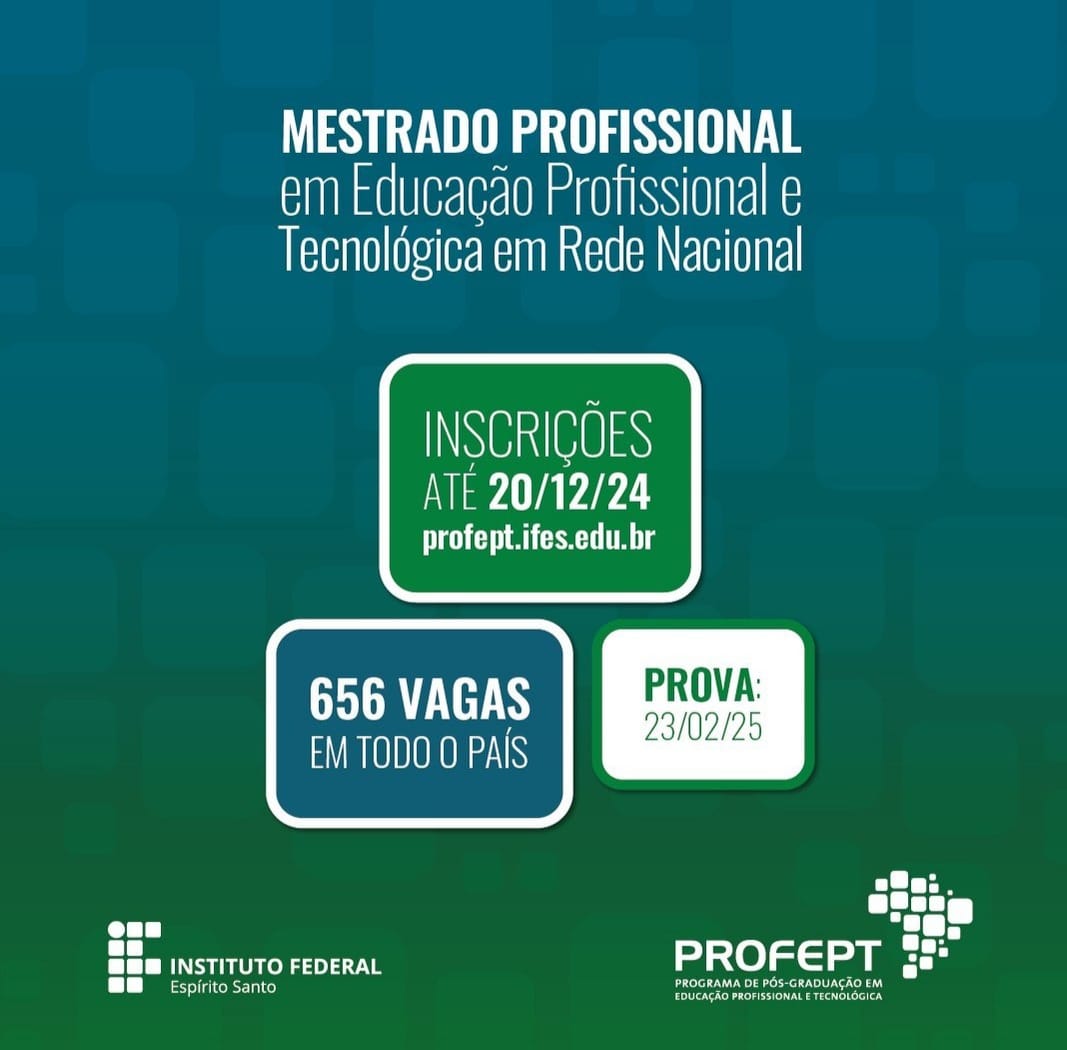 O Mestrado Profissional em Educação Profissional e Tecnológica - ProfEPT é destinado a servidores e docentes que atuam nas diversas redes de ensino, especialmente na área de Educação Profissional e Tecnológica (EPT). Este é um mestrado em rede, oferecido pelos Institutos Federais de Educação em todo o Brasil, com um total de 656 vagas distribuídas entre as 40 instituições associadas ao programa, abrangendo todo o território nacional.
