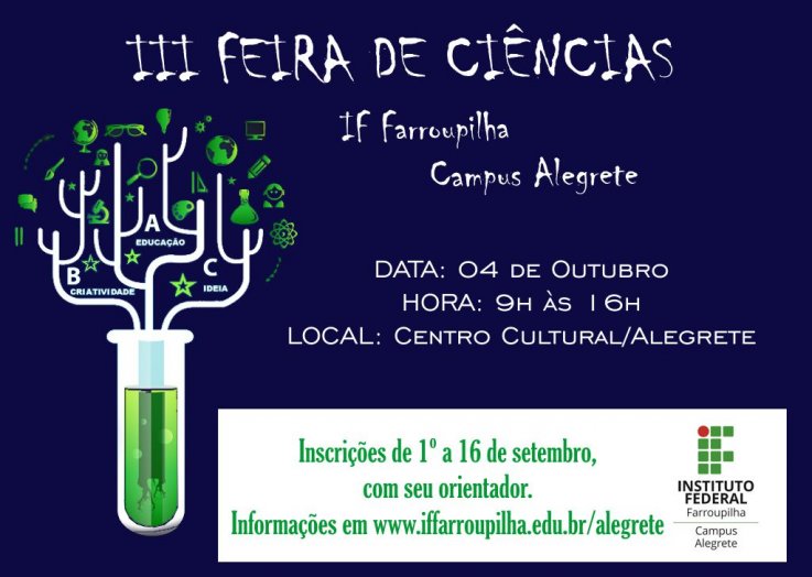 Estão abertas, até dia 16 de setembro, as inscrições para a 3ª edição da Feira de Ciências do Instituto Federal Farroupilha - Campus Alegrete. Com o objetivo de integrar a teoria à prática, o evento é direcionado aos alunos do Ensino Médio, os quais são motivados a levarem seus conhecimentos e experimentos até o centro da cidade e apresentá-los à comunidade externa.