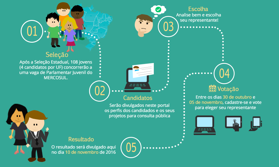 Eleições - A seleção ocorre por meio da votação dos alunos do Ensino Médio com idades entre 14 e 18 anos, pelo site do PJM (http://pjm.mec.gov.br/). As eleições ocorrem no período de 30 de outubro a 5 de novembro e poderão votar todos os jovens com idade entre 14 e 18 anos, com ou sem vínculo a uma unidade escolar.