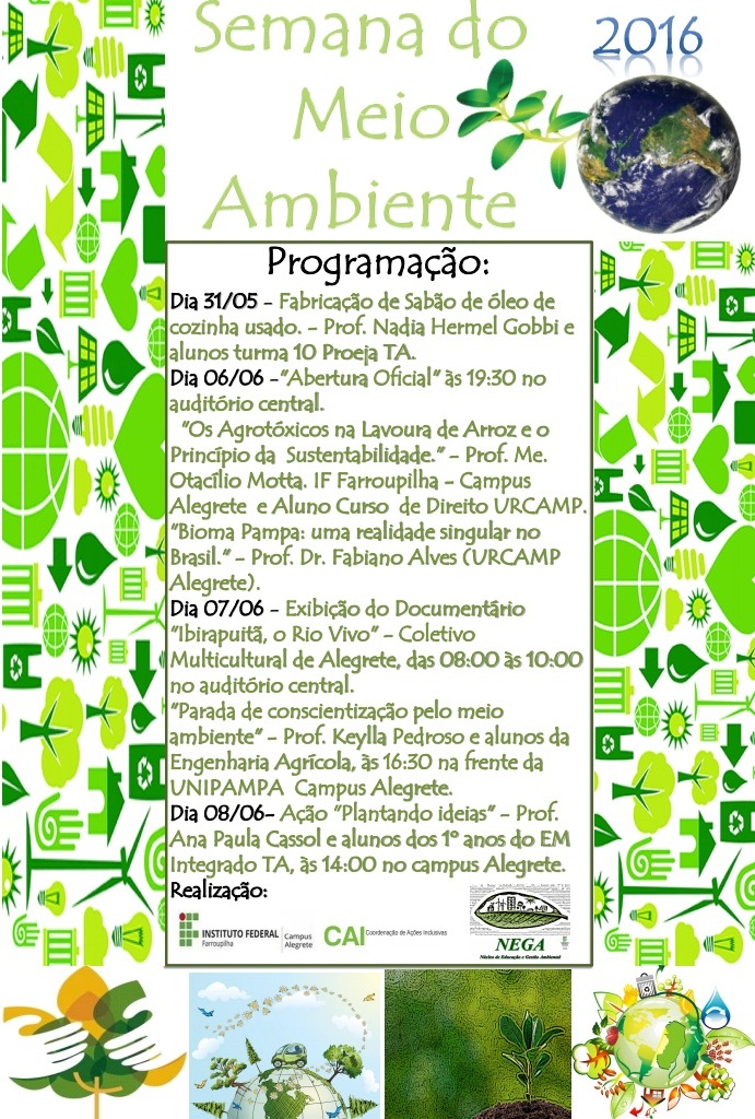 As atividades serão realizadas no IF Farroupilha Campus Alegrete e a "Parada de conscientização pelo Meio Ambiente" será concentrada na frente da Unipampa Campus Alegrete. Participem!