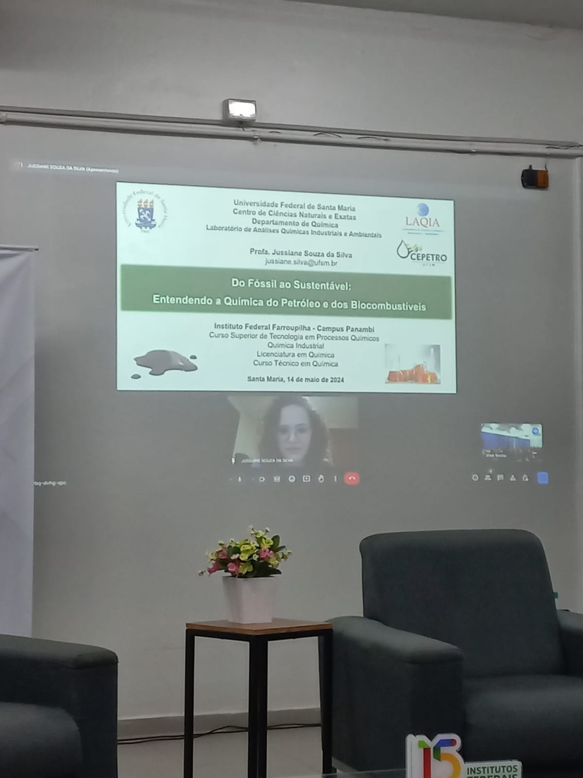 Segunda Noite (14 de maio): A Prof. Dra. Jussiane da Silva, da UFSM, abordou o tema "Do Fóssil ao Sustentável: entendendo a Química do Petróleo e dos Biocombustíveis", explorando a transição dos combustíveis fósseis para alternativas mais sustentáveis.
