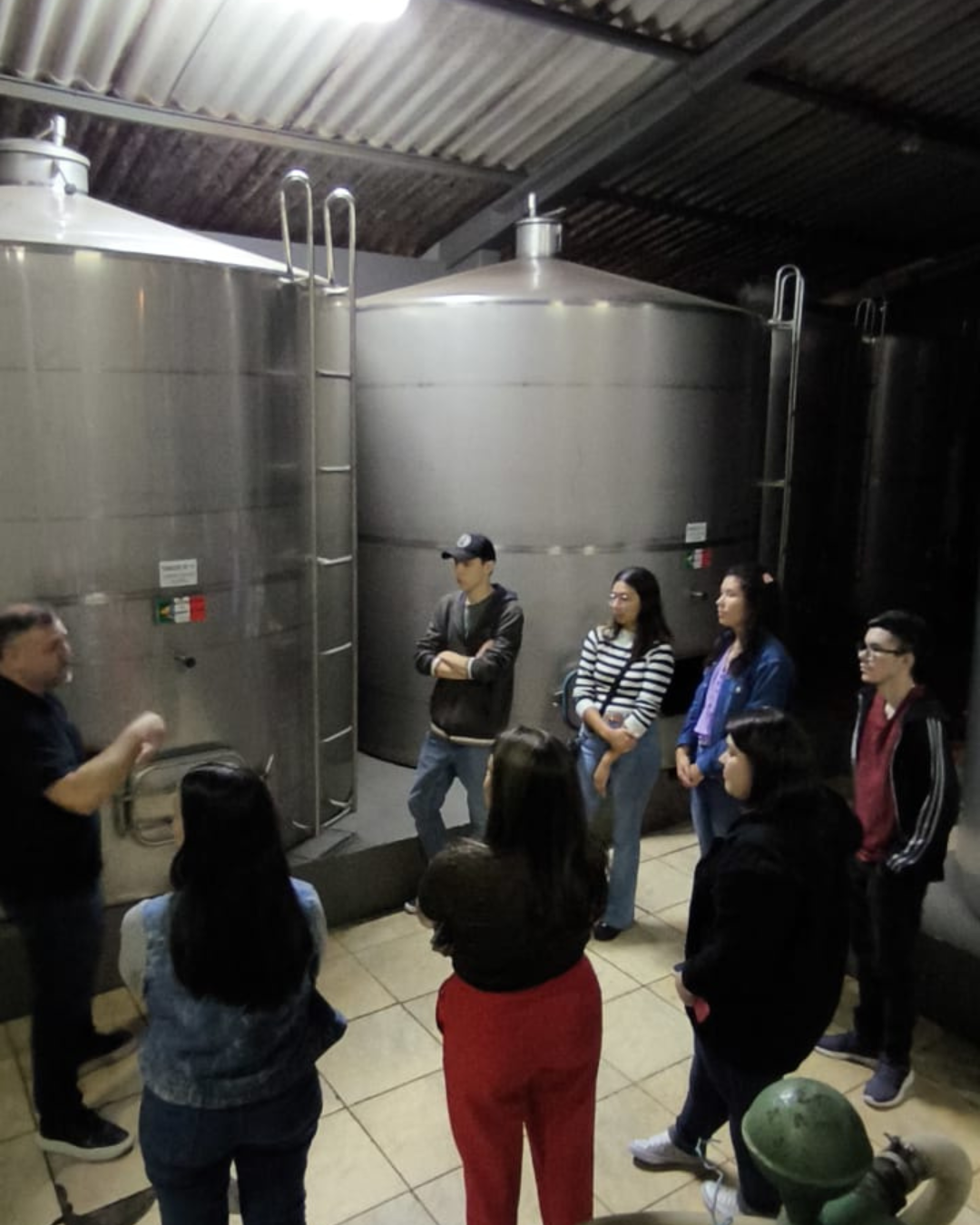 Alunos dos cursos de Tecnologia em Processos Químicos e Bacharelado em Química Industrial do IFFar – Campus Panambi participaram de uma visita técnica à Vinícola Bagolin, em Cruz Alta (RS), como atividade da disciplina Prática Profissional Integrada II, sob orientação da professora Larissa Alves.