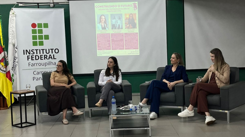 A atividade reuniu quatro convidadas que atuam na área: Maísa Dahmer, engenheira civil na Cotripal; Daiane Schindler e Betina Scheuer, arquitetas e fundadoras da LIV Arquitetura; e Rafaela Noll, arquiteta com experiência em projetos residenciais e comerciais. O evento contou também com a presença e participação da professora Fabiane Van Ass Malheiros, coordenadora do curso técnico em Edificações.