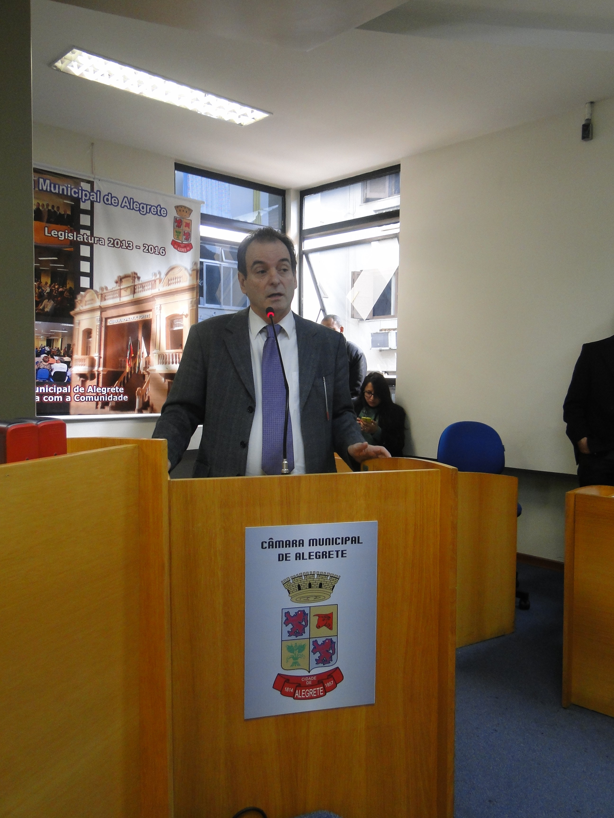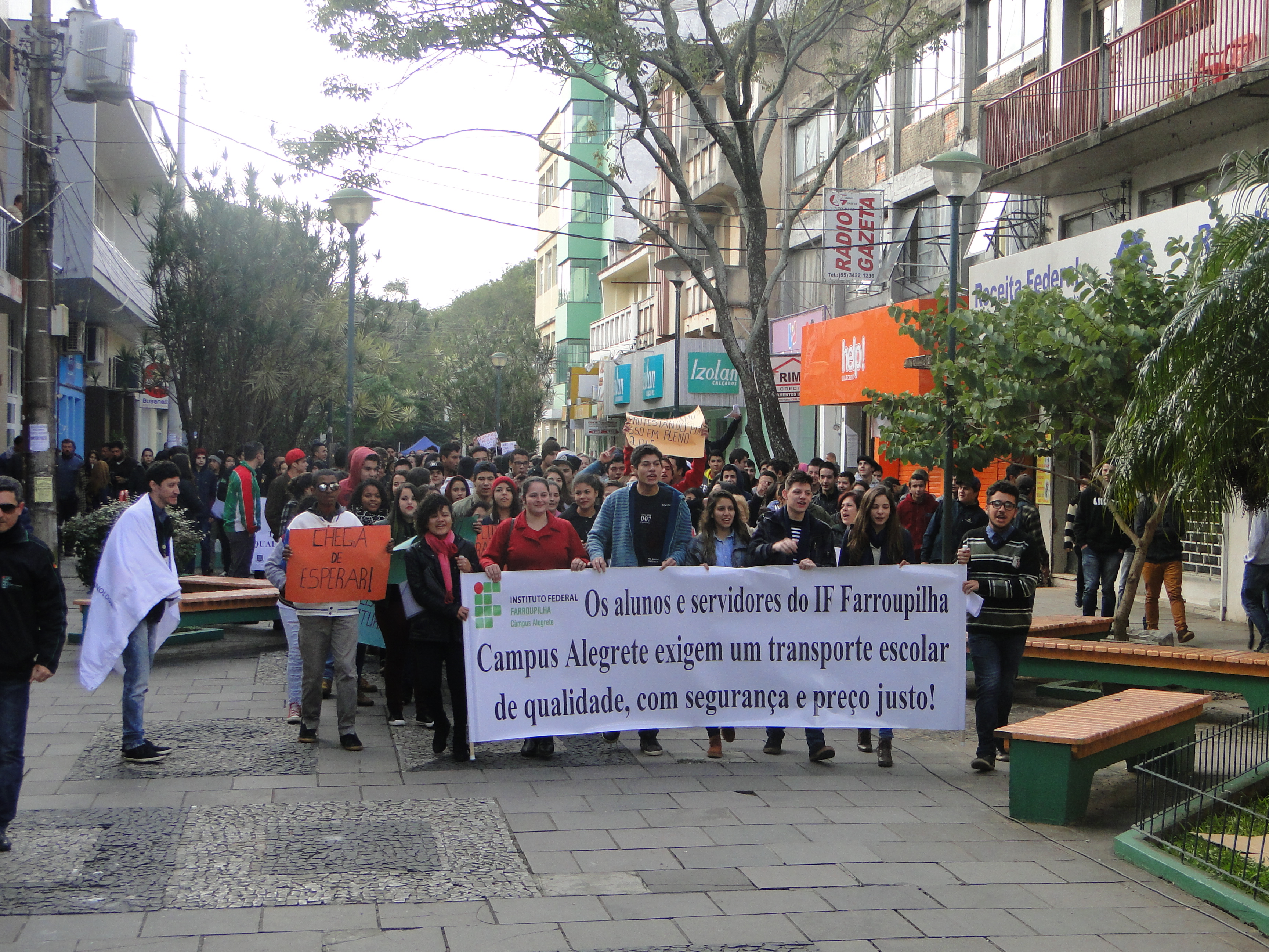 Durante muitos anos a Direção Geral do Campus vem lutando, junto aos alunos e aos servidores, por um transporte de qualidade e com preço justo que faça a linha Alegrete - Passo Novo/IF Farroupilha - Alegrete. Na quinta-feira, dia 02, através desse esforço, a Direção conseguiu um espaço regimental durante a sessão da Câmara de Vereadores de Alegrete. A comunidade acadêmica reuniu-se para, em caminhada, ir até a Câmara. Com faixas e cartazes, estudantes, professores e técnicos-administrativos lotaram o plenário da casa.