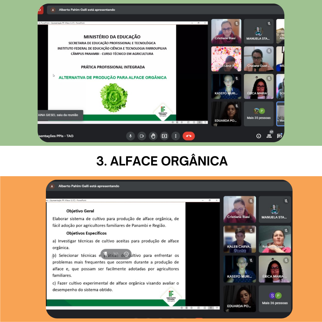 - Outro grupo irá estudar a produção de alface orgânica. A proposta de cultivo de alface orgânica será elaborada com o propósito de atender aos agricultores familiares do município de Panambi, RS. Uma das metas é de elaborar e levar ao produtor, técnicas de fácil acesso para o cultivo de alface orgânica. Desenvolver, na prática, um sistema de cultivo da cultura e verificar sobre a viabilidade econômica e social para estes produtores familiares.