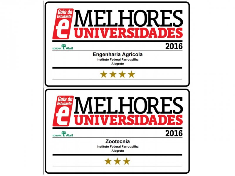 A Direção Geral do Instituto Federal Farroupilha - Campus Alegrete, juntamente às Coordenações dos cursos de Engenharia Agrícola (IFFar/Unipampa) e Zootecnia, tem a honra de comunicar que os cursos citados foram estrelados na avaliação de cursos superiores realizada pelo Guia do Estudante (GE) no ano de 2016 e constará da publicação GE Profissões Vestibular 2017, que passa a circular nas bancas a partir do dia 14 de outubro.