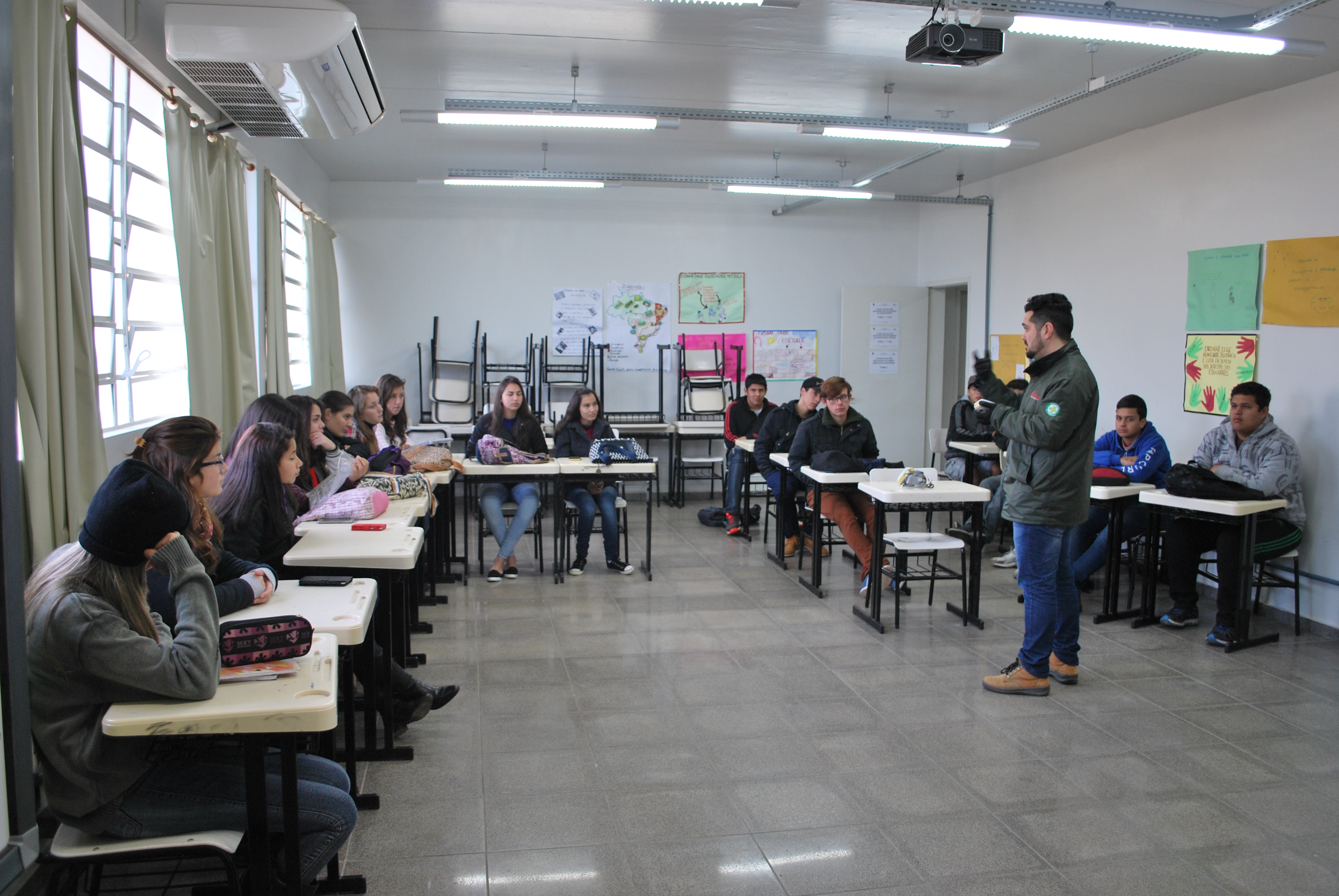Na quarta-feira (10/10) foi comemorado o Dia Nacional de Segurança e Saúde nas Escolas em âmbito Institucional. As atividades no Campus Jaguari contemplaram a conversa sobre dependência química com o jaguariense Claudio Lena, do Grupo Fátima/Amor-Exigente de Santa Maria - RS.