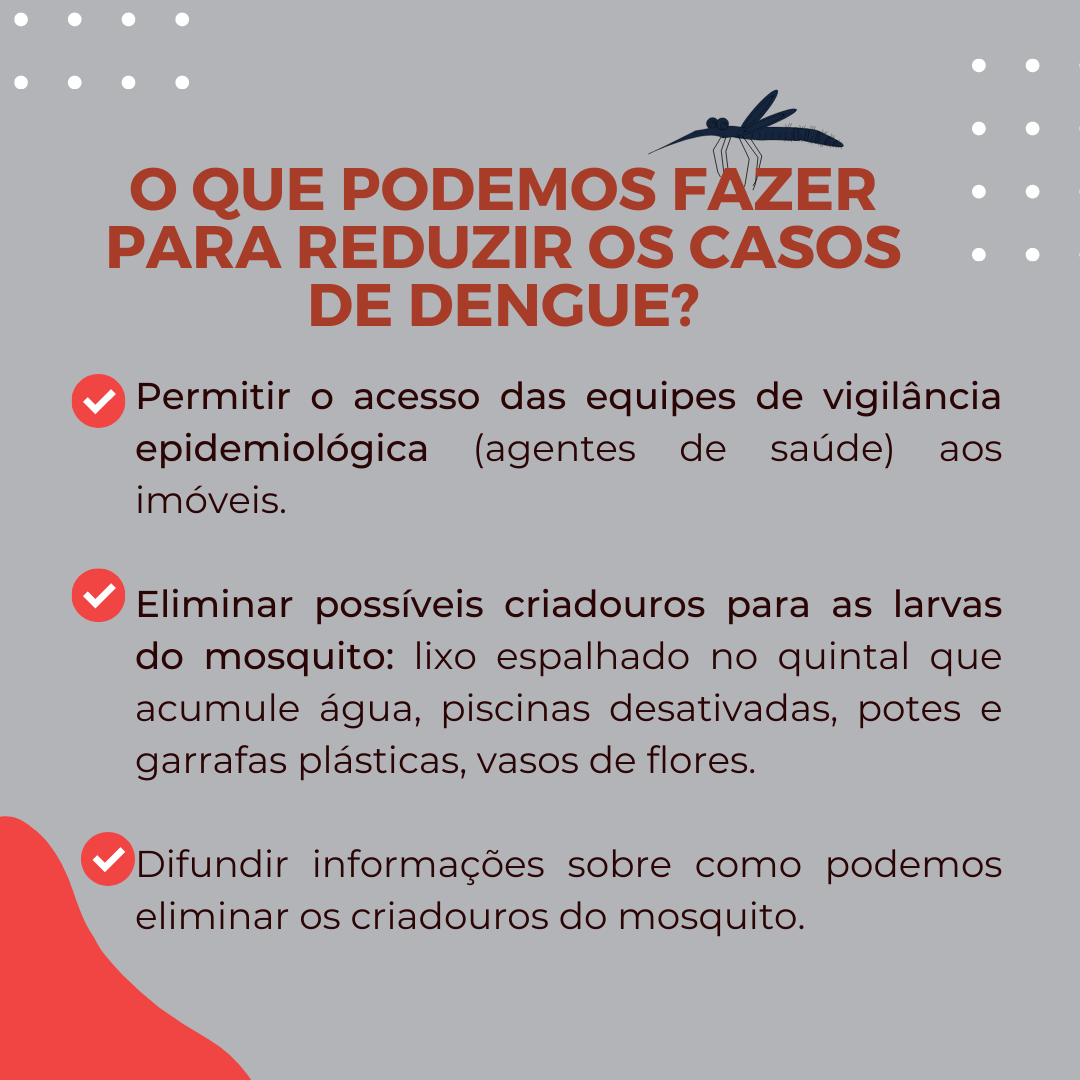 O que funciona contra a dengue? 1) Eliminar criadouros; 2) Usar repelente com icaridina (20%) ou com DEET em sua composição, lembrando que crianças não devem usar repelente com DEET maior que 10%; 3) Medidas de proteção individual e vacina.