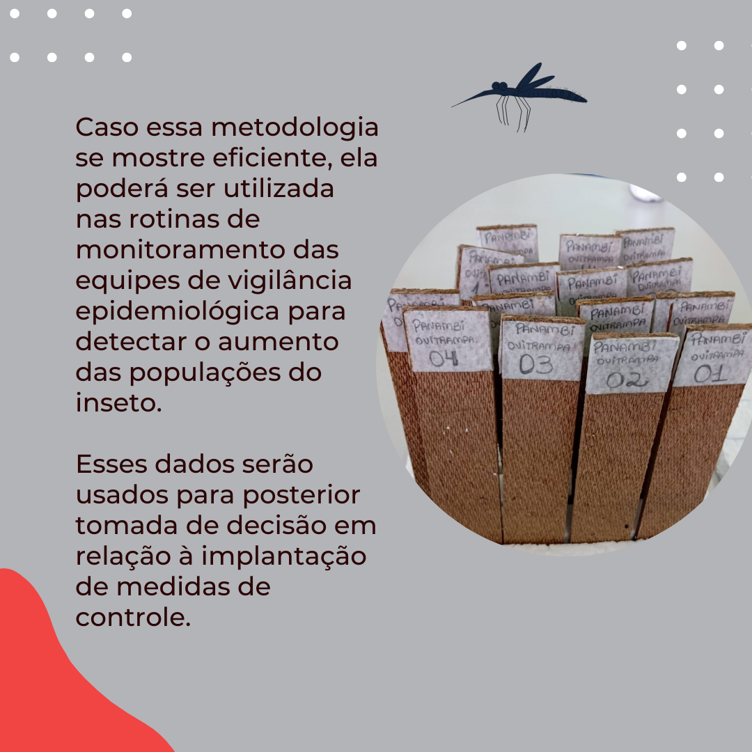 Caso essa metodologia se mostre eficiente, ela poderá ser utilizada nas rotinas de monitoramento das equipes de vigilância epidemiológica dos municípios para detectar o aumento das populações do inseto para posterior tomada de decisão em relação à implantação de medidas de controle.