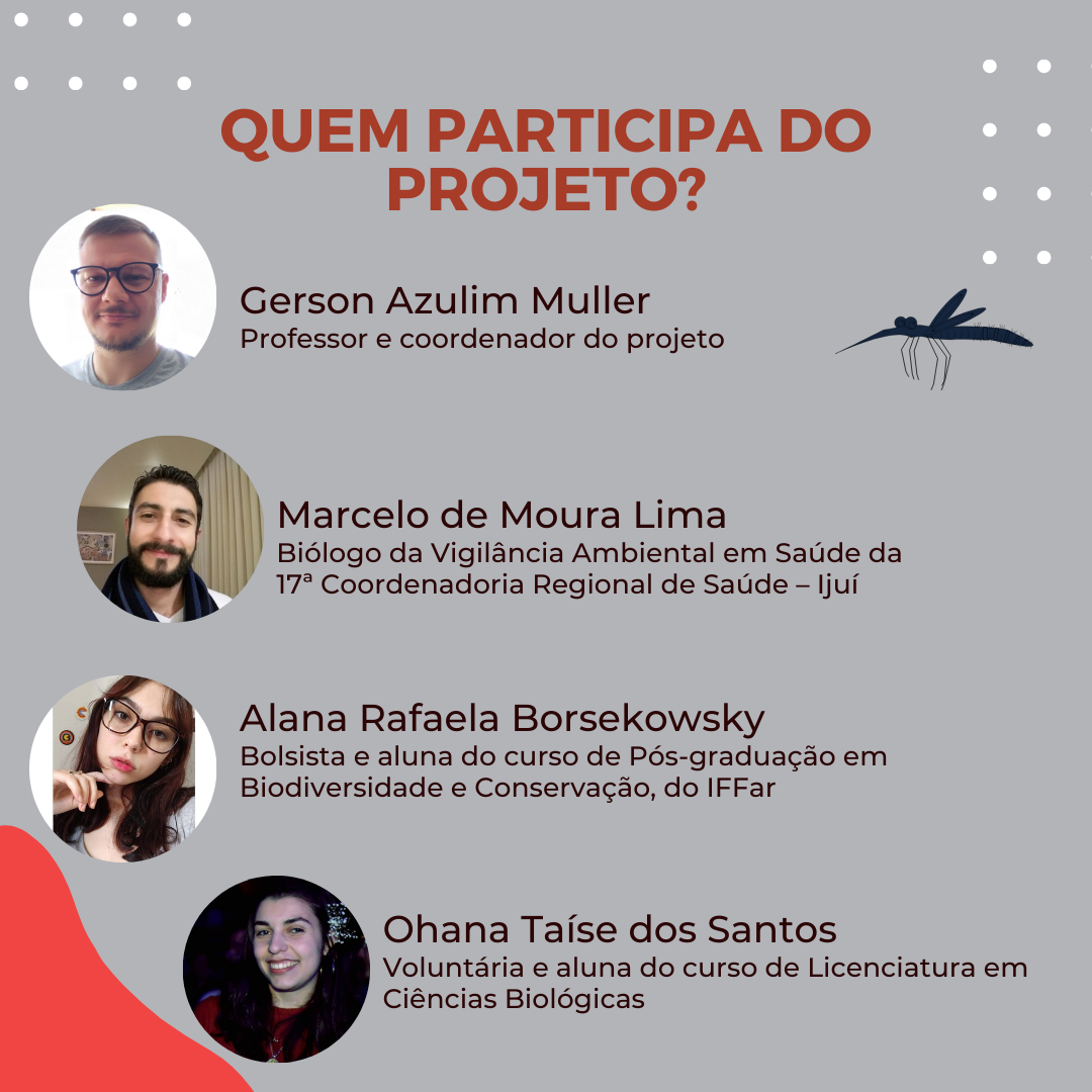 O projeto “Prevalência de parasitas zoonóticos em praças infantis do município de Panambi” possui a orientação de Gerson Azulim Müller e conta com a colaboração de dois bolsistas: Brenda Zanetti e Robson Leal do Santos, acadêmicos do 7º semestre de Licenciatura em Ciências Biológicas, e Yasmin Teixeira, também aluna de Ciências Biológicas, que atua como voluntária.