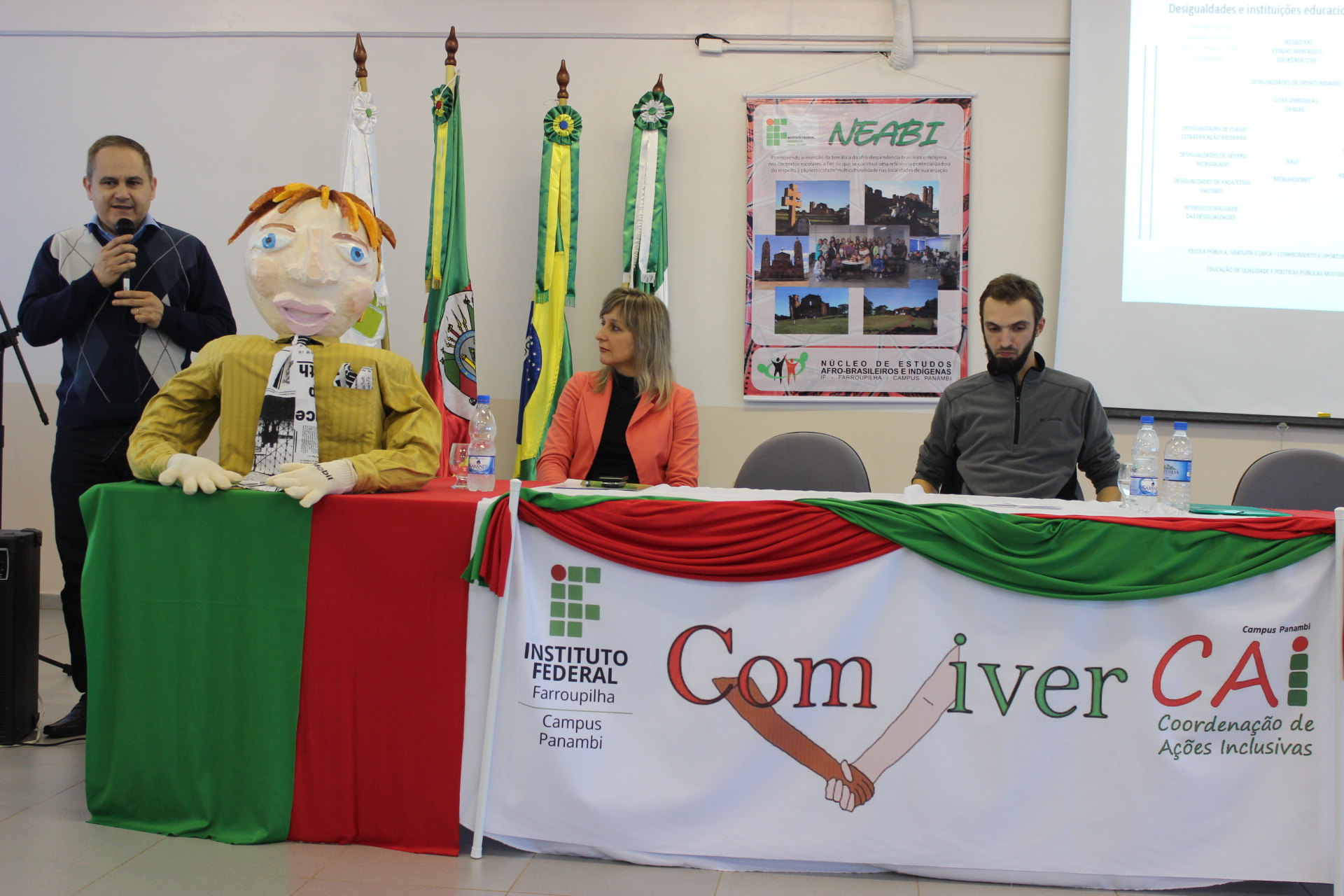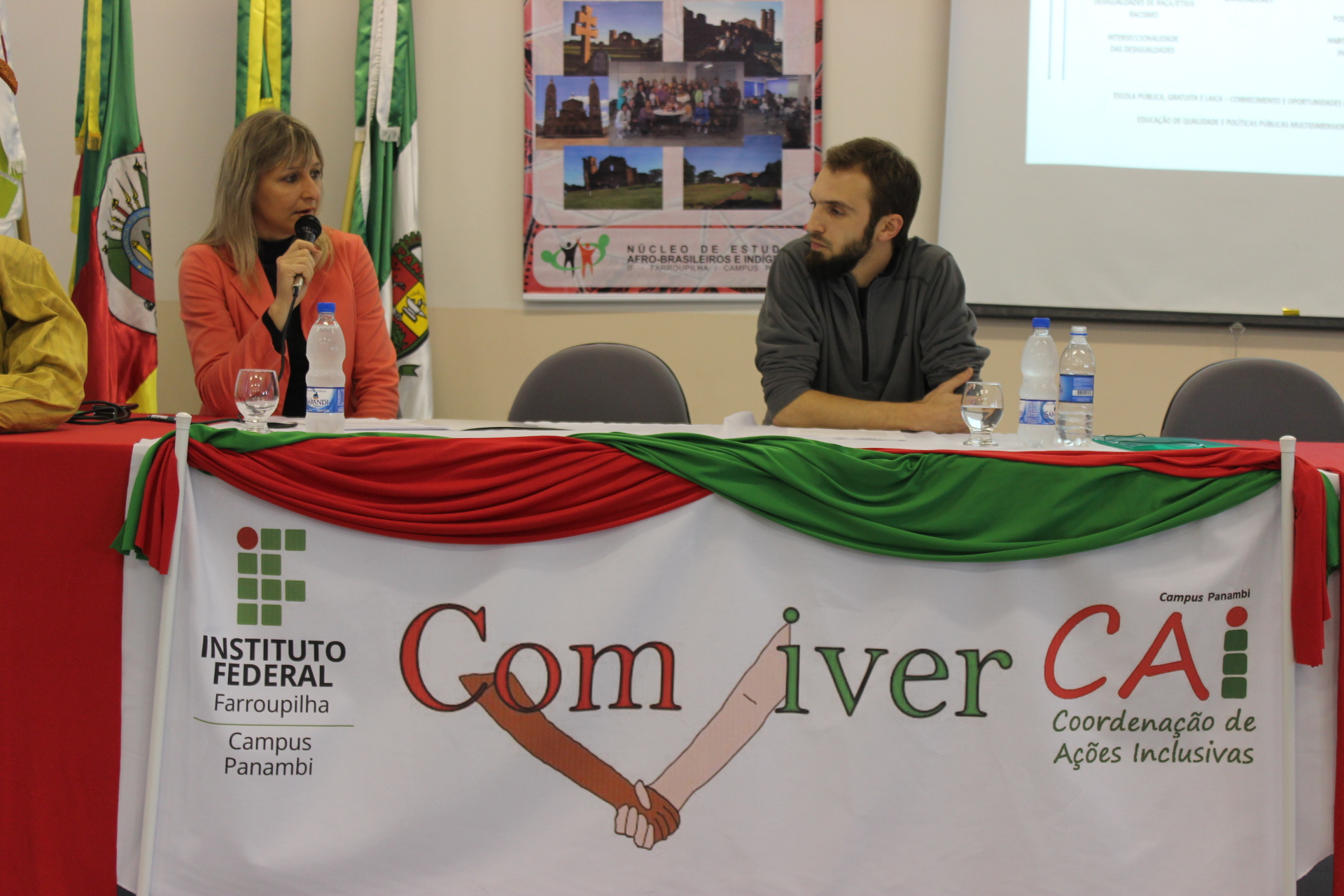 Édison Gonzague Brito da Silva, Diretor de Ensino da Pró-Reitoria de Ensino do Instituto Federal Farroupilha e Susi Mara Alves, Coordenadora da CAI Reitoria ampliaram as reflexões sobre o papel da educação em relação à diversidade humana, sobretudo no contexto educacional, resultando em uma participação atuante durante o evento. Também estiveram presentes, compartilhando experiências e reflexões, integrantes do Grupo de Articulação para Inclusão de Pessoas com Deficiência no Mercado de trabalho de Panambi; da Secretaria Municipal de Educação; do Conselho Municipal de Educação e do CAPS João-de-barro, ligado à Secretaria Municipal da Saúde.