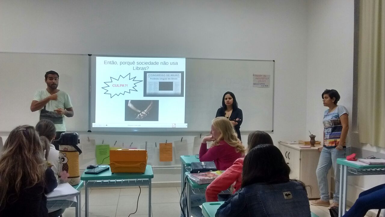 Nas explanações, os integrantes do NAPNE contextualizam a data e aspectos principais acerca do Surdo e sobre a Libras, apoiados na distribuição do folder “Aprendendo sobre a Surdez”, instigando a tod@s a desenvolver ao menos formas básicas de comunicação com colegas surd@s.