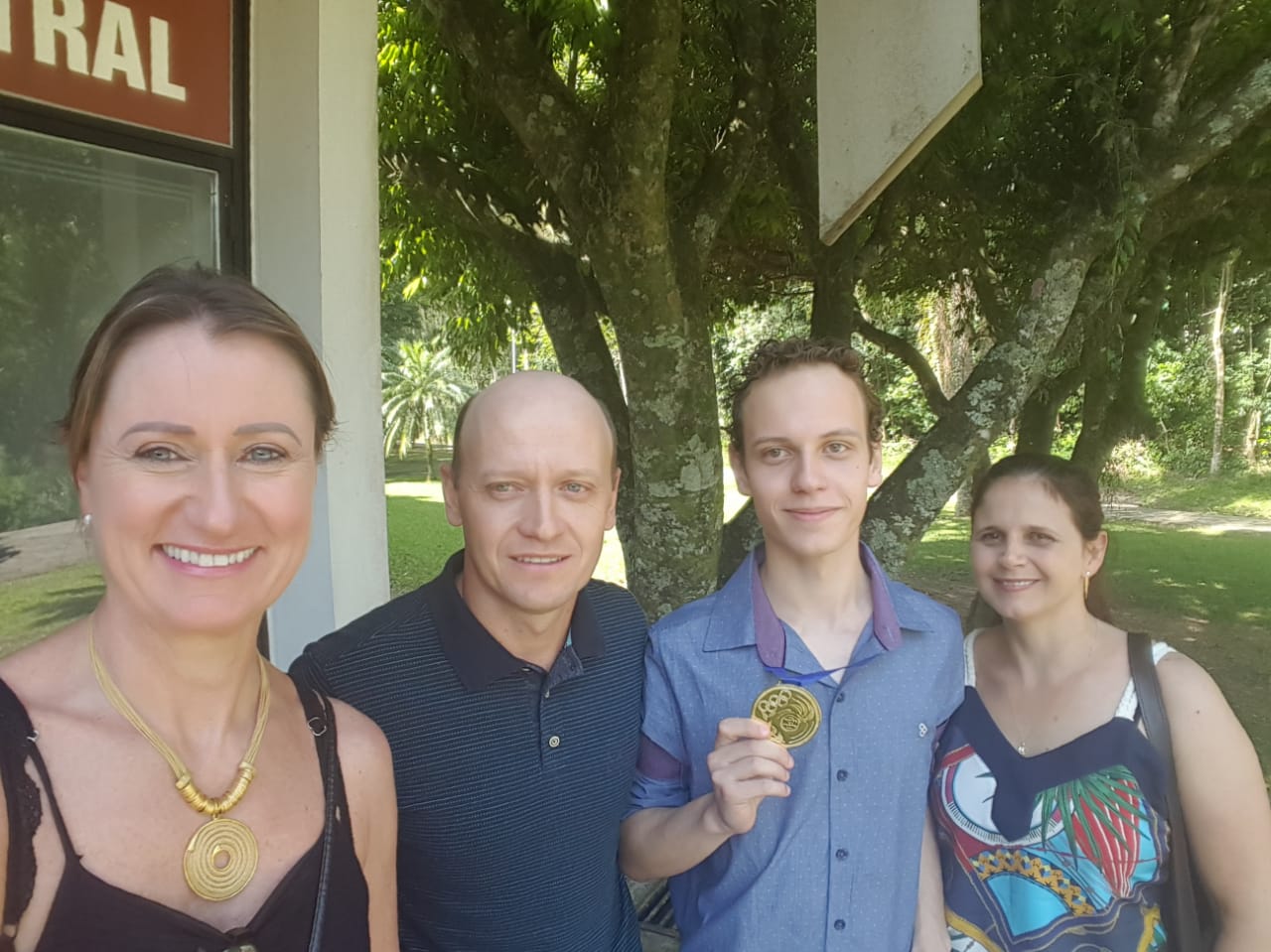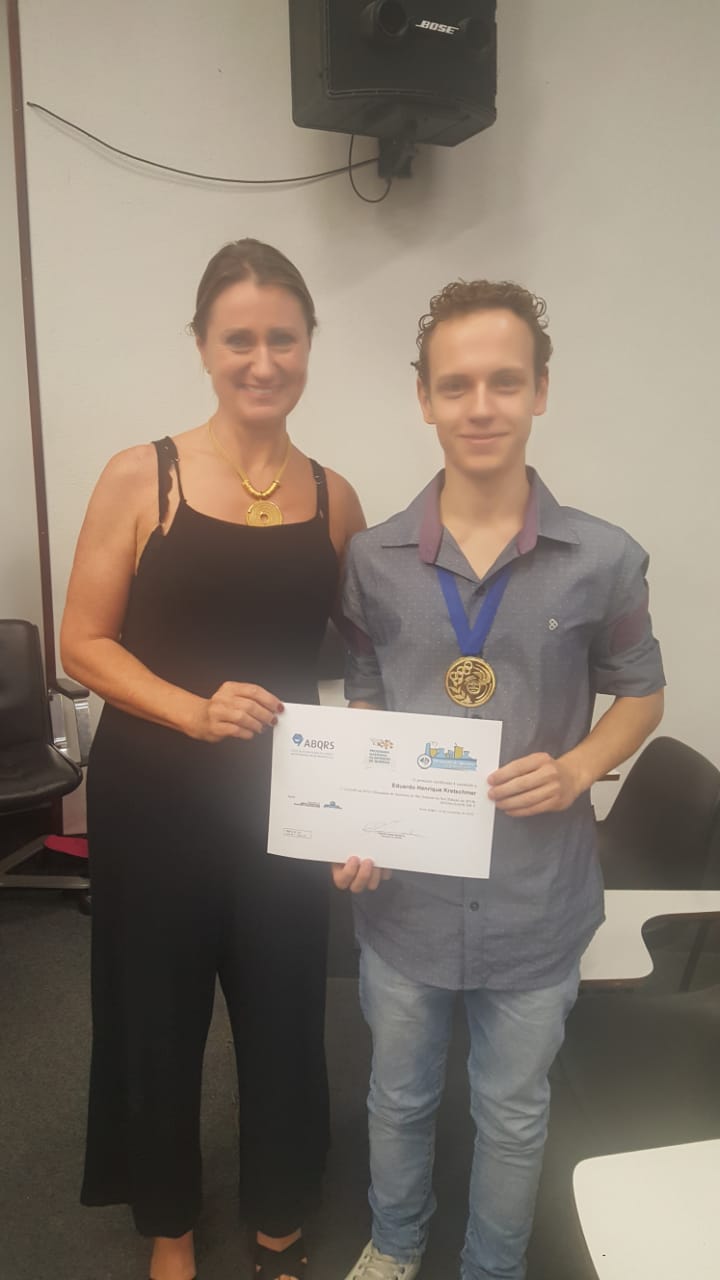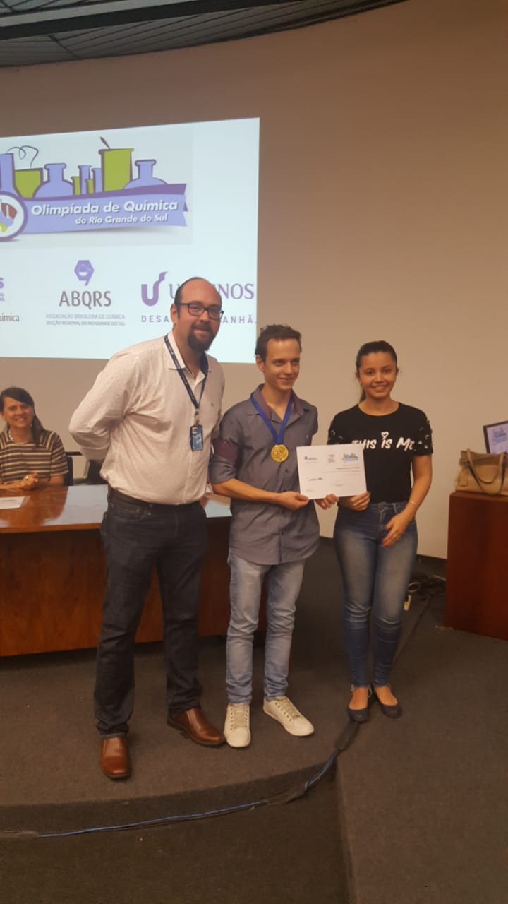 O estudante Eduardo Henrique Kretschmer, do 3º ano do curso Técnico Integrado em Edificações, do IFFar – Campus Santa Rosa, conquistou a medalha de ouro na XVIII Olimpíada de Química do RS. A solenidade de premiação ocorreu na tarde de ontem (18), no Auditório Central da Unisinos – Campus São Leopoldo. O aluno foi ao evento acompanhado pelos pais e pela professora de Química, Dra. Vera Klajn. Eduardo participou da Olimpíada em 2018 e 2017 também, enquanto cursava o 1º e 2º ano do ensino médio. Ele conta que as participações anteriores e as atividades como monitor da disciplina de Química serviram como preparação para esse ano. "Agradeço aos alunos que procuram a monitoria, porque ao ajudar os colegas a solucionar alguma dificuldades em relação aos conteúdos trabalhados nas aulas de Química, acabo reforçando meu aprendizado".