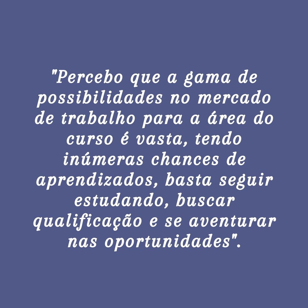 Percebo que a gama de possibilidades no mercado de trabalho para a área do curso é vasta, tendo inúmeras chances de aprendizados, basta seguir estudando, buscar qualificação e se aventurar nas oportunidades.