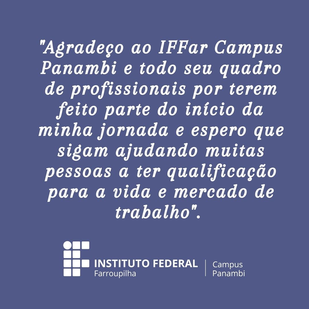 Agradeço ao IFFar Campus Panambi e todo seu quadro de profissionais por terem feito parte do início da minha jornada e espero que sigam ajudando muitas pessoas a ter qualificação para a vida e mercado de trabalho".
