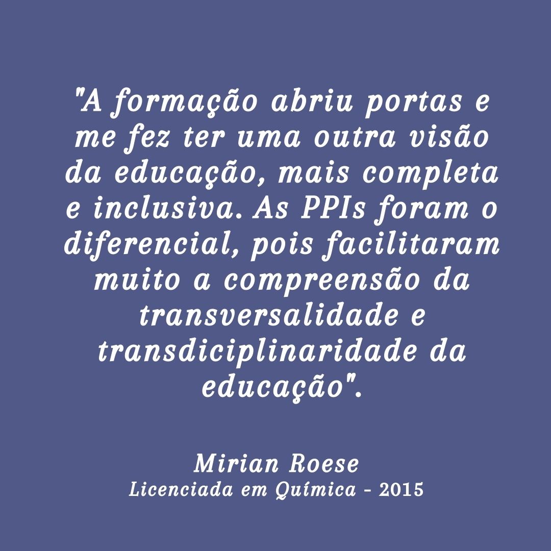 Mirian concluiu a graduação em 2015 e fez opção por atuar junto às Redes Estaduais de Educação, primeiramente no Estado de Santa Catarina (2017 a 2020) e atualmente no Rio Grande do Sul, onde atua como docente da área de química no município de Canela.