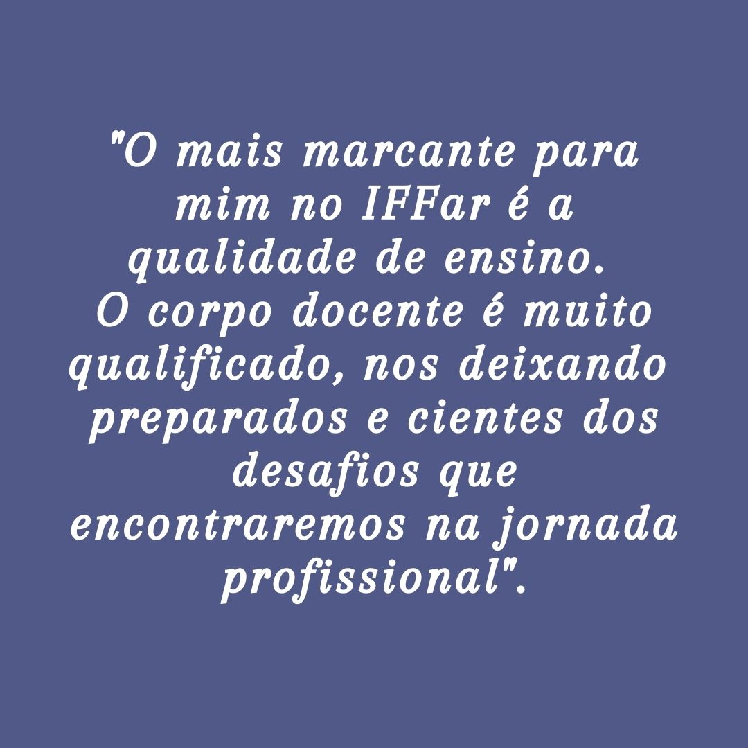O mais marcante para mim no IFFar é a qualidade de ensino. O corpo docente da instituição é muito qualificado, além da experiência dos professores, que nos deixam muito preparados e cientes dos desafios que encontraremos na jornada profissional.