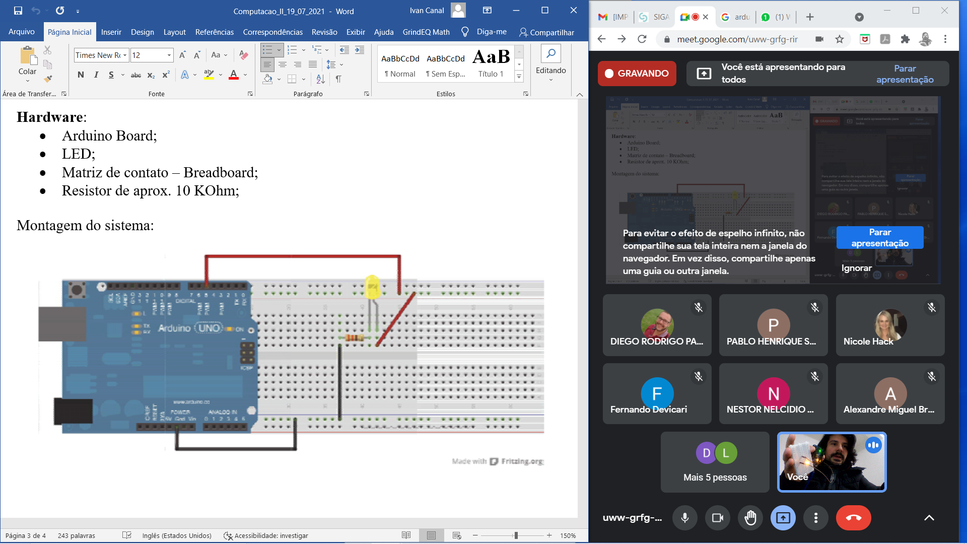 #PraTodosVerem: prints de telas do Software Scilab; da Plataforma Arduino; de uma montagem do hardware para testes em aula e de aula de Computação II, com o professor Ivan.