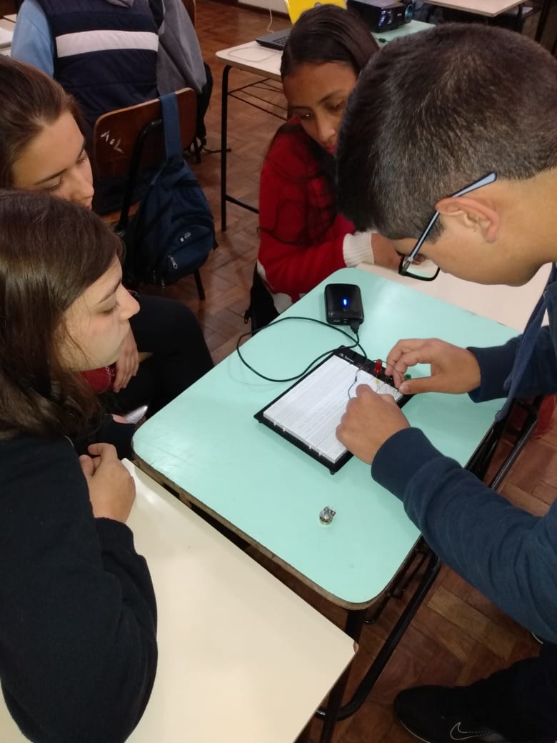 Alunos de 9º ano da Escola Municipal de Ensino Fundamental Dona Leopoldina, de Panambi, estão sendo contemplados com o curso “Arduino e suas aplicações práticas”. O curso é ofertado como projeto de extensão, sendo ministrado pelo aluno extensionista João Vitor da Luz Silveira, egresso da escola e atualmente estudante do 1º ano do Curso Técnico em Automação Industrial do IFFar – Campus Panambi. A orientação do projeto é do professor Julian Cezar Giacomini.