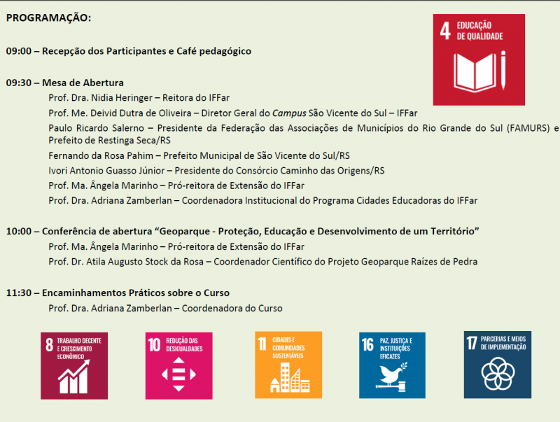 O Curso “Território que se educa” tem carga horária total de 40h e é uma de formação continuada cujo objetivo é o de desenvolver saberes relacionados ao território que compõem o Geoparque “Raízes de Pedra”, dos quais fazem parte os municípios de Jaguari, Mata, Nova Esperança do Sul, São Francisco de Assis, São Pedro do Sul e São Vicente do Sul.