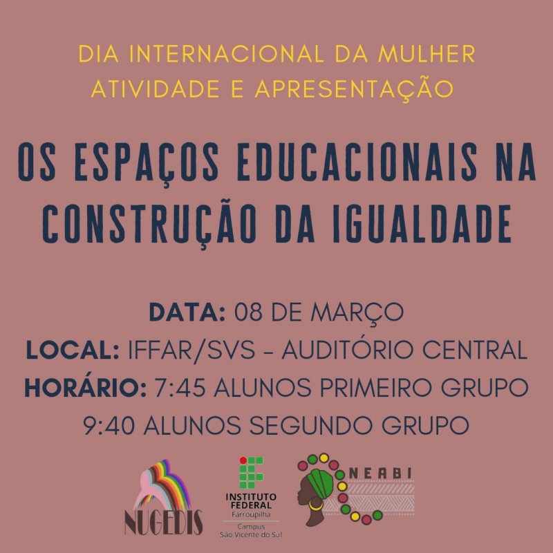 Em alusão ao Dia Internacional da Mulher, dia 08/03, o Núcleo de Gênero e Diversidade Sexual, Nugedis, organizou uma programação especial para o mês de março com diversas atividades. Na quarta-feira, no turno da manhã, haverá atividade para os(as) estudantes "Os espaços educacionais na construção da igualdade", às 8h e às 09:40h, no auditório central.