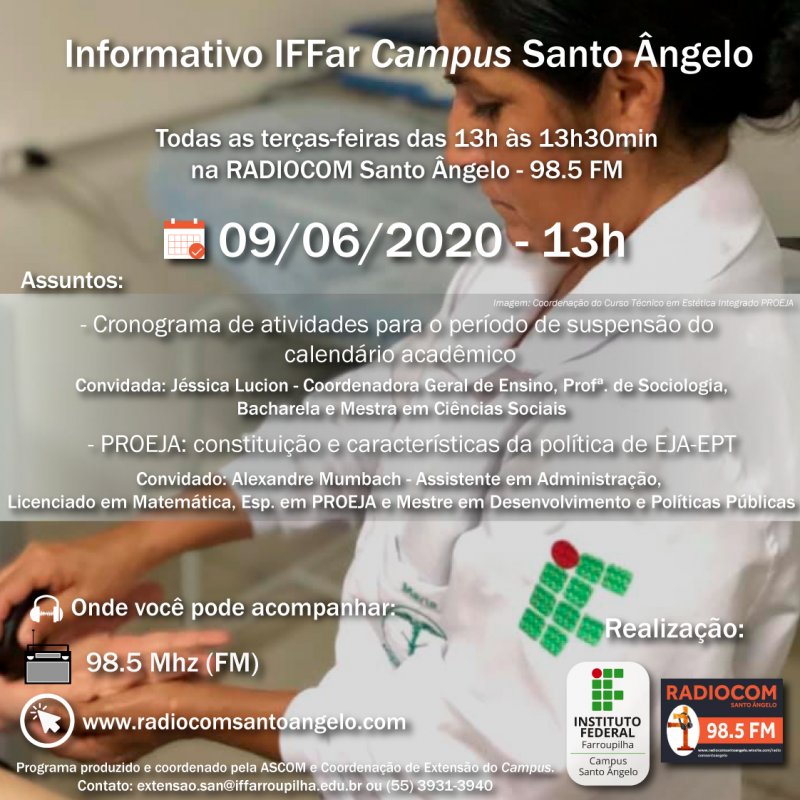 Assuntos: Cronograma de atividades para o período de suspensão do calendário acadêmico. Convidada: Jéssica Lucion - Coordenadora Geral de Ensino, Profª. de Sociologia, Bacharela e Mestra em Ciências Sociais. PROEJA: constituição e características da política de EJA-EPT. Convidado: Alexandre Mumbach - Assistente em Administração, Licenciado em Matemática, Especialista em PROEJA e Mestre em Desenvolvimento e Políticas Públicas.