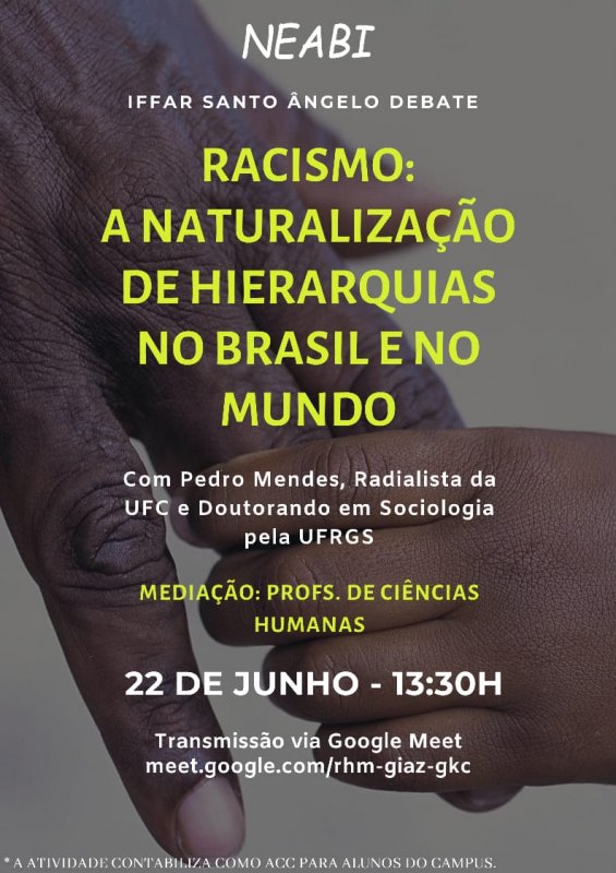 ? Hoje (22/06), às 13h30min acompanhe um Debate sobre Racismo: a naturalização de hierarquias no Brasil e no Mundo, promovido pelo Núcleo de Estudos Afro-brasileiros e Indígenas – NEABI do IFFar Campus Santo Ângelo, via Google Meet.