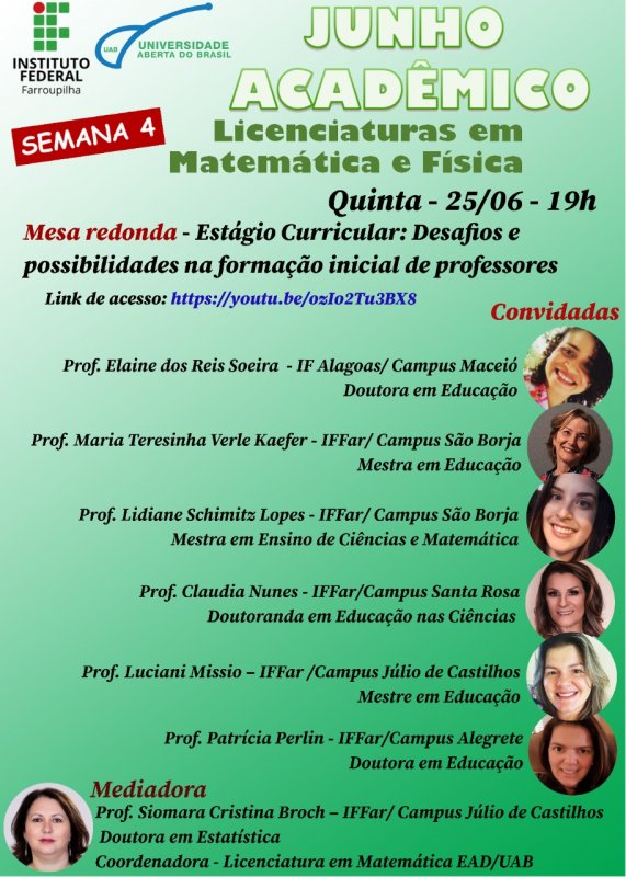 Página inicial > Eventos Institucionais > Mesa Redonda: Estágio Curricular Supervisionado: desafios e possibilidades na formação inicial de professores [Junho Acadêmico das Licenciaturas]