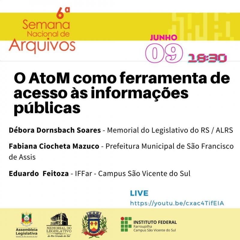 A palestra “O AtoM como ferramenta de acesso às instituições públicas’ ocorrerá no dia 09/06/2022, as 18:30, e será transmitido através do link https://youtu.be/cxac4TifEIA. Outra atividade que está sendo desenvolvida é o podcast Arquivos Modernos, que pode ser acessado aqui.