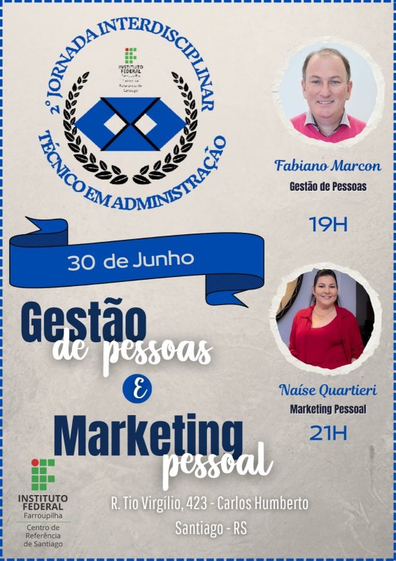 Os estudantes e professores do I semestre do Curso Técnico em Administração Subsequente do Instituto Federal Farroupilha Campus Jaguari/ Centro de Referência de Santiago convidam colegas, professores, servidores, administradores, gestores ou interessados nas temáticas, a participar da 2ª Jornada de Estudos Interdisciplinares do Curso Técnico em Administração, a realizar-se nos dias 29 e 30 de junho no Centro de Referência de Santiago a partir das 19 horas.