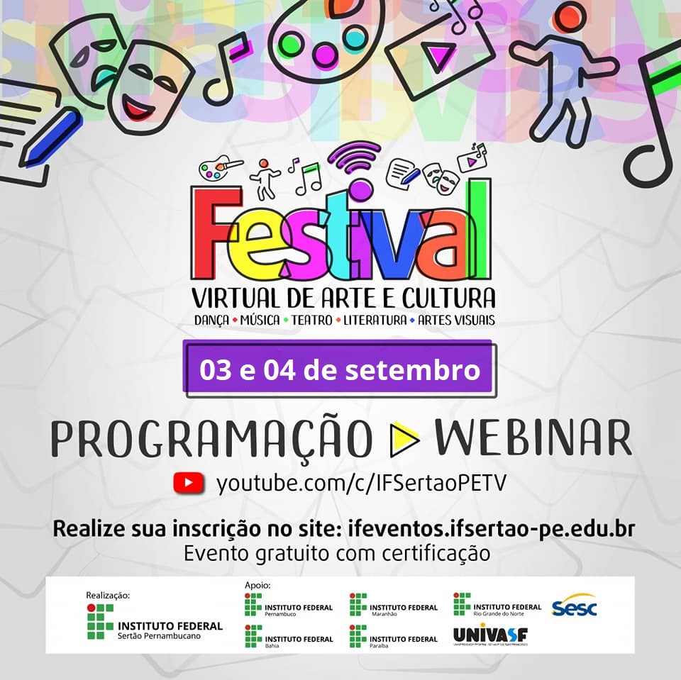 O Instituto Federal do Sertão Pernambucano está promovendo nesta semana, de 02 a 04/09/2020 o I Festival Virtual de Arte e Cultura.