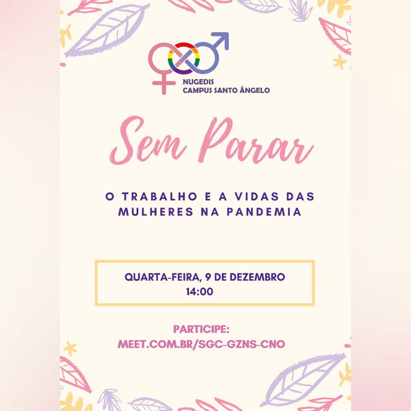 Convidamos tod@s a participarem do evento realizado pelo NUGEDIS do IFFar Campus Santo Ângelo intitulado: "Sem parar: o trabalho e a vida das mulheres na pandemia". O evento se dará na forma de bate-papo entre as convidadas e abordará a situação de sobrecarga de trabalho relatada pelas mulheres em tempos de pandemia.