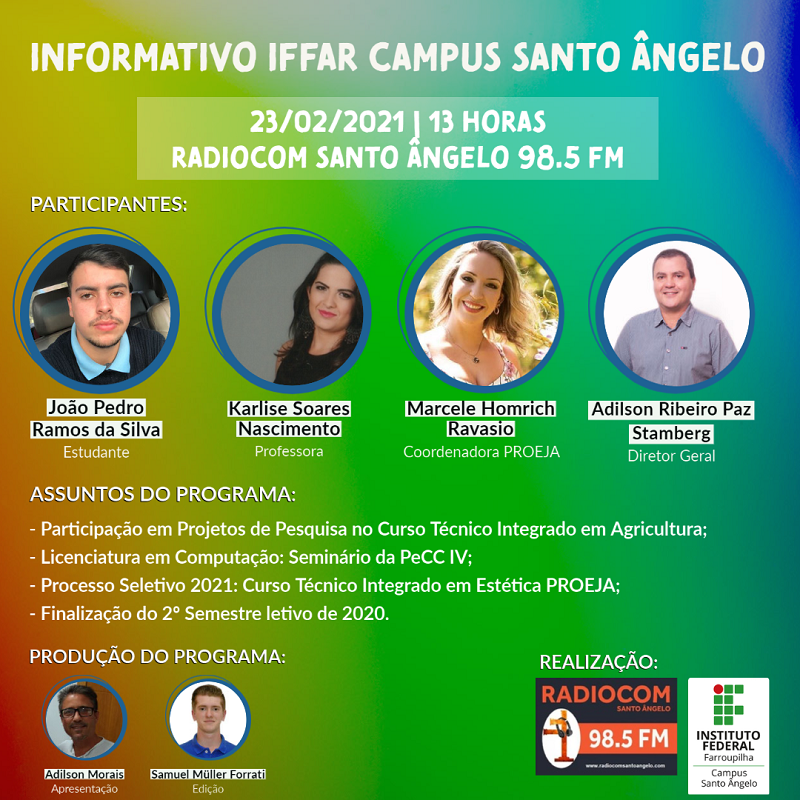 Nesta terça-feira (23/02) às 13h, acompanhe AO VIVO o Informativo do IFFar SAN no seu rádio (98.5 FM), celular ou computador, através da RADIOCOM Santo Ângelo.