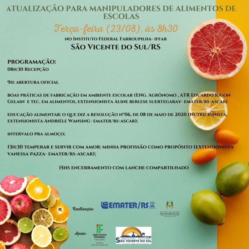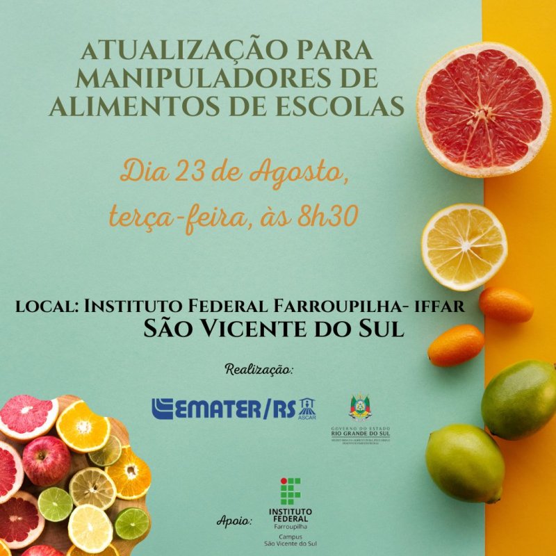 Na terça-feira, dia 23 de agosto, o Campus São Vicente do Sul sedia uma formação voltada para manipuladores de alimentos das escolas da região. Promovida pela EMATER-RS, a atividade abordará temas relacionados ao papel dos manipuladores de alimentos e gestores escolares, como por exemplo, boas práticas de fabricação de alimentos em ambiente escolar e orientações sobre a Resolução nº 6, de 08 de maio de 2020.
