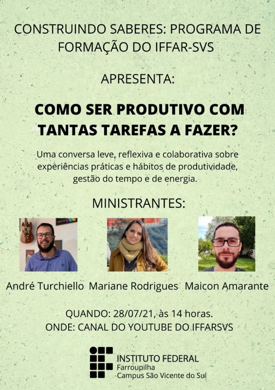 Na próxima quarta-feira, dia 28/07, às 14 horas, haverá a transmissão de um bate-papo intitulado "Como ser produtivo com tantas tarefas a fazer?", que será ministrado pelos servidores André Turchiello e Maicon Amarante, técnico-administrativos em educação do IFFAR-SVS, com mediação da servidora Mariane Rodrigues de Aguiar.