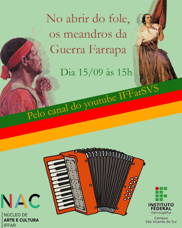 O Núcleo de Arte e Cultura (NAC IFFar-SVS) convida a todos e todas para este evento alusivo à Semana Farroupilha. A atividade tem o objetivo de ser momento reflexivo sobre o 20 de setembro e contará com apresentações artístico-culturais com gaiteiros e declamações, além de uma discussão acerca do papel do negro e da mulher na guerra farrapa. A transmissão acontece no canal do IFFar SVS no Youtube: https://www.youtube.com/watch?v=jP8hB3DZdzw