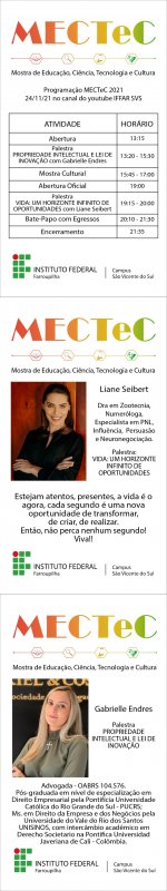 Dia 24 de novembro acontece a Mostra de Educação, Ciência, Tecnologia e Cultura (MECTeC) 2021, do Instituto Federal Farroupilha – Campus São Vicente do Sul. O tema da mostra deste ano é “Ciência, tecnologia, inovação e a transversalidade em tempo de pandemia”.