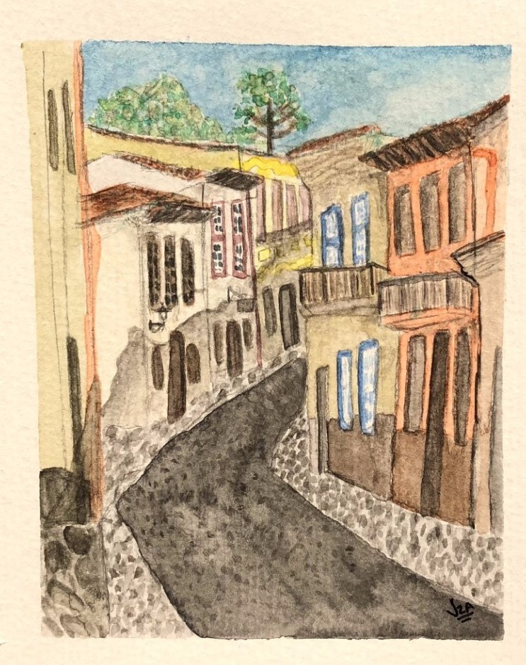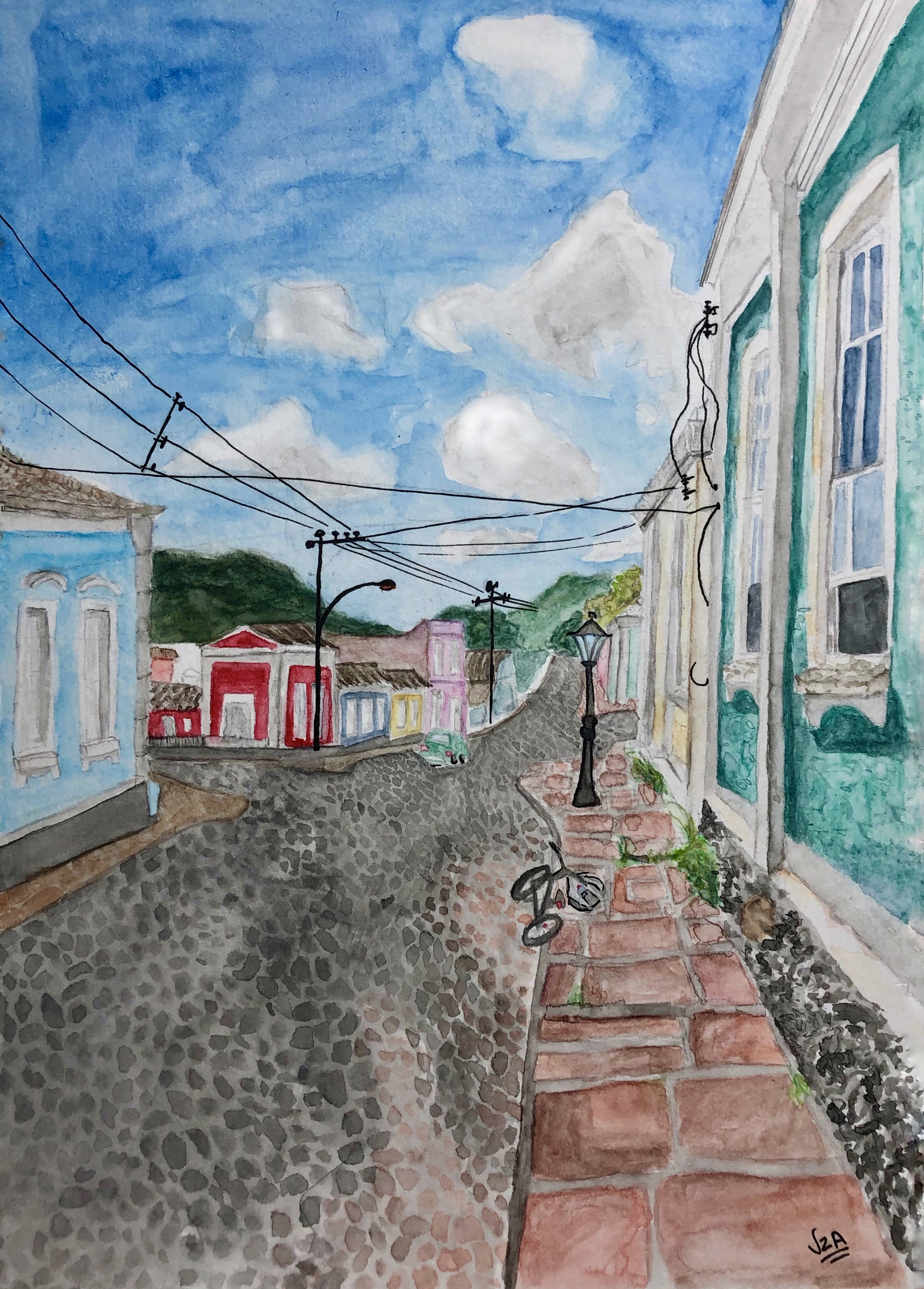 A técnica de aquarela utiliza tinta e água. A composição das imagens é realizada com manchas de cor. A tinta de aquarela é transparente e a quantidade de água reflete na expressividade da cor que cria matizes e tons. As pinturas são realizadas sobre diversos tipos de papéis, proporcionando diferentes texturas ao trabalho plástico. Dessa forma as cores vivas criam cenários harmoniosos e revelam uma obra que expressa dedicação e conhecimento.