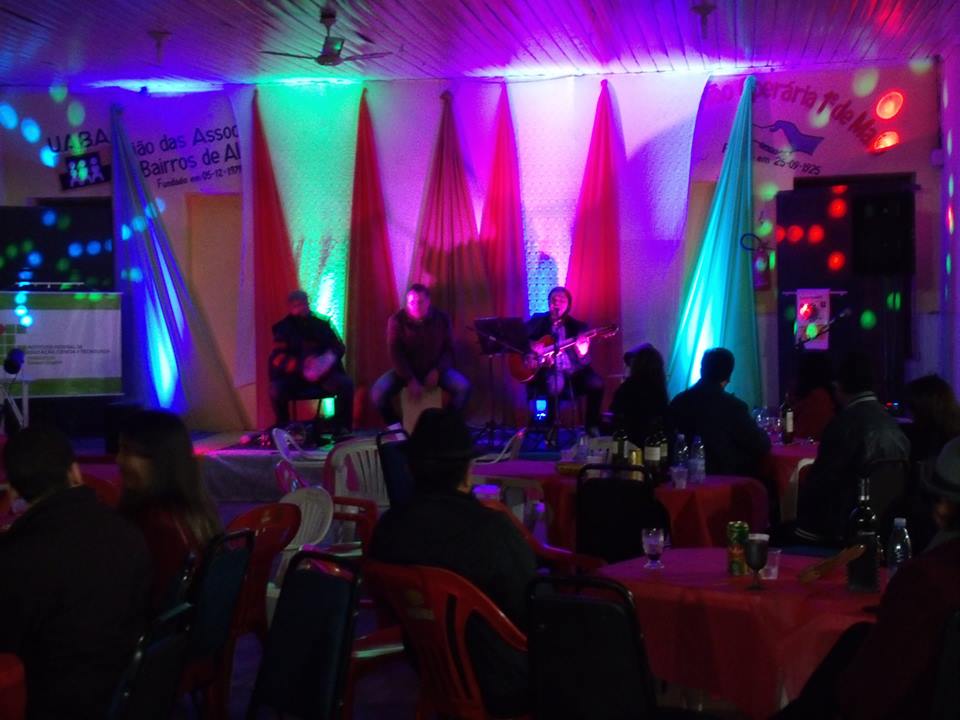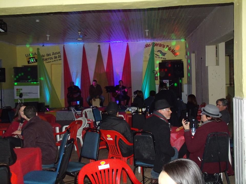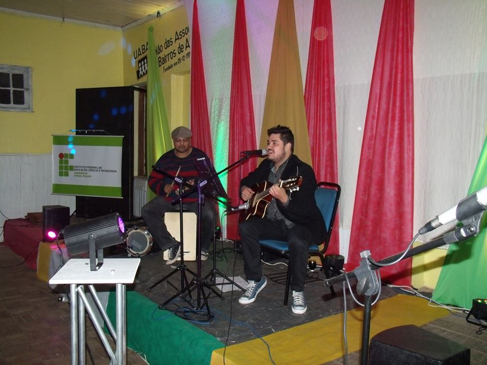 No dia 24 de junho, o NEABI – Núcleo de Estudos Afro Brasileiros e Indígenas do IF Farroupilha Campus Alegrete, teve o prazer de participar como apoiador do evento organizado pelo Núcleo de Cultura do Clube União Operária de Alegrete: “A contribuição negra para a música popular brasileira”. O evento foi uma palestra show com o cantor Thiago Simon e percussão de Giovane Castilhos. Thiago apresentou, em voz e violão, acompanhando pela adequada marcação rítmica e exemplar percussão do Giovane, um painel do samba brasileiro - homenageado da noite - começando por “Pelo Telefone”, o primeiro samba gravado, cujo centenário é comemorado neste ano. A decoração e sonorização, ficou a cargo do professor e membro do NEABI, Tiago Rosa.