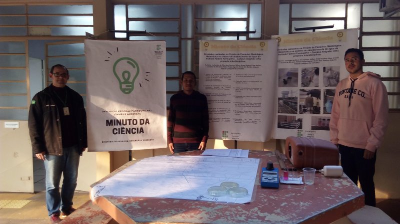 No dia 6 de setembro de 2019, os acadêmicos Juliander da Silva dos Santos, do Curso de Licenciatura em Química e Rafael Felipe Aguiar, do Curso de Licenciatura em Ciências Biológicas, juntamente com o Prof. Luciano de Oliveira, realizaram a exposição do trabalho desenvolvido no projeto de Pesquisa ‘‘Modelagem Matemática no sistema de abastecimento de água do Instituto Federal Farroupilha – Campus Alegrete: uma proposta interdisciplinar’’, o qual tem como objetivo principal desenvolver modelos matemáticos que representem a real situação do sistema de abastecimento de água do instituto, em atividades que contemplem e envolvam as áreas da Biologia, Química e Matemática.