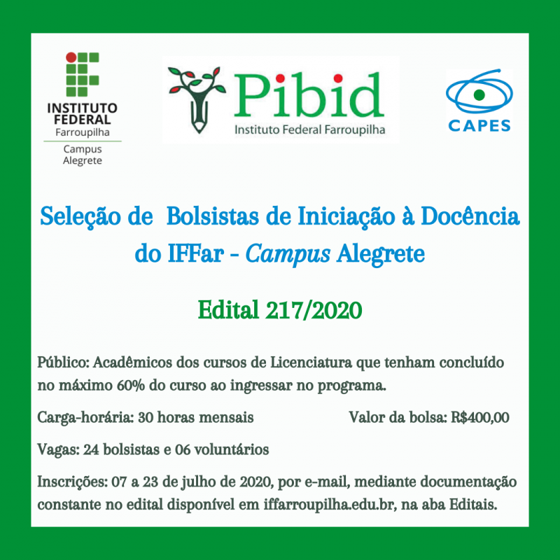 Na última terça-feira, dia 07 de julho, foi publicado o Edital nº 217/2020, que rege a seleção de Bolsistas de Iniciação a Docência - PIBID IFFar 2020.