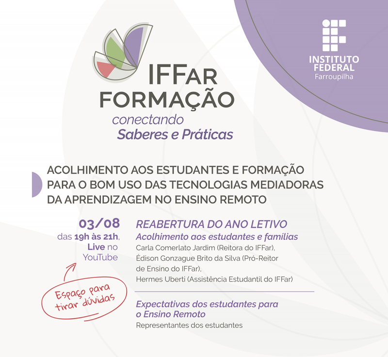 Para marcar a reabertura do ano letivo de forma remota no IFFar, será realizada uma programação especial destinada aos estudantes durante o programa de formação pedagógica “IFFar Formação: conectando saberes e práticas”, na segunda-feira (03), das 19h às 21h.