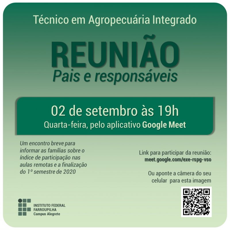 A coordenação do curso Técnico em Agropecuária Integrado do Instituto Federal Farroupilha - Campus Alegrete comunica à comunidade estudantil, alunos e familiares, que haverá reunião do curso dia 02 de setembro, quarta-feira, às 19h, pela plataforma Google Meet no link meet.google.com/exe-rspg-vso.