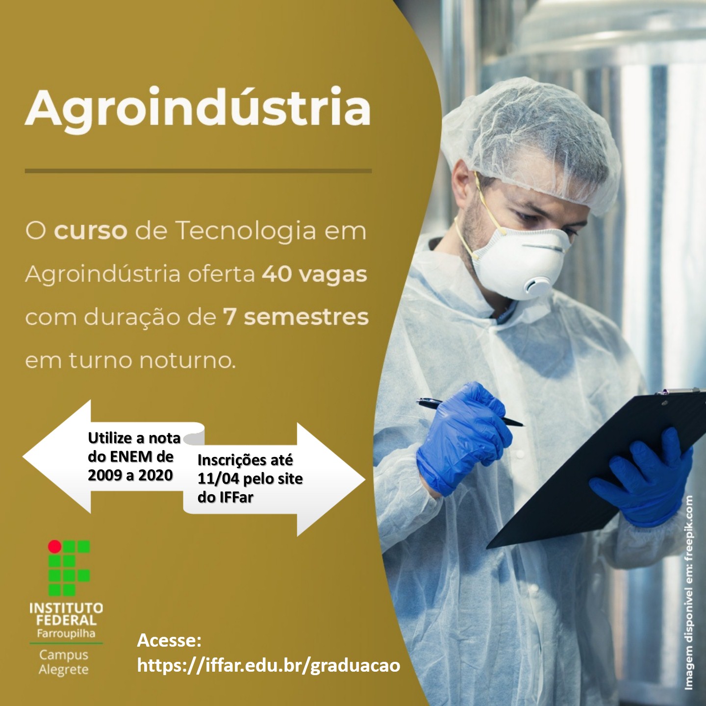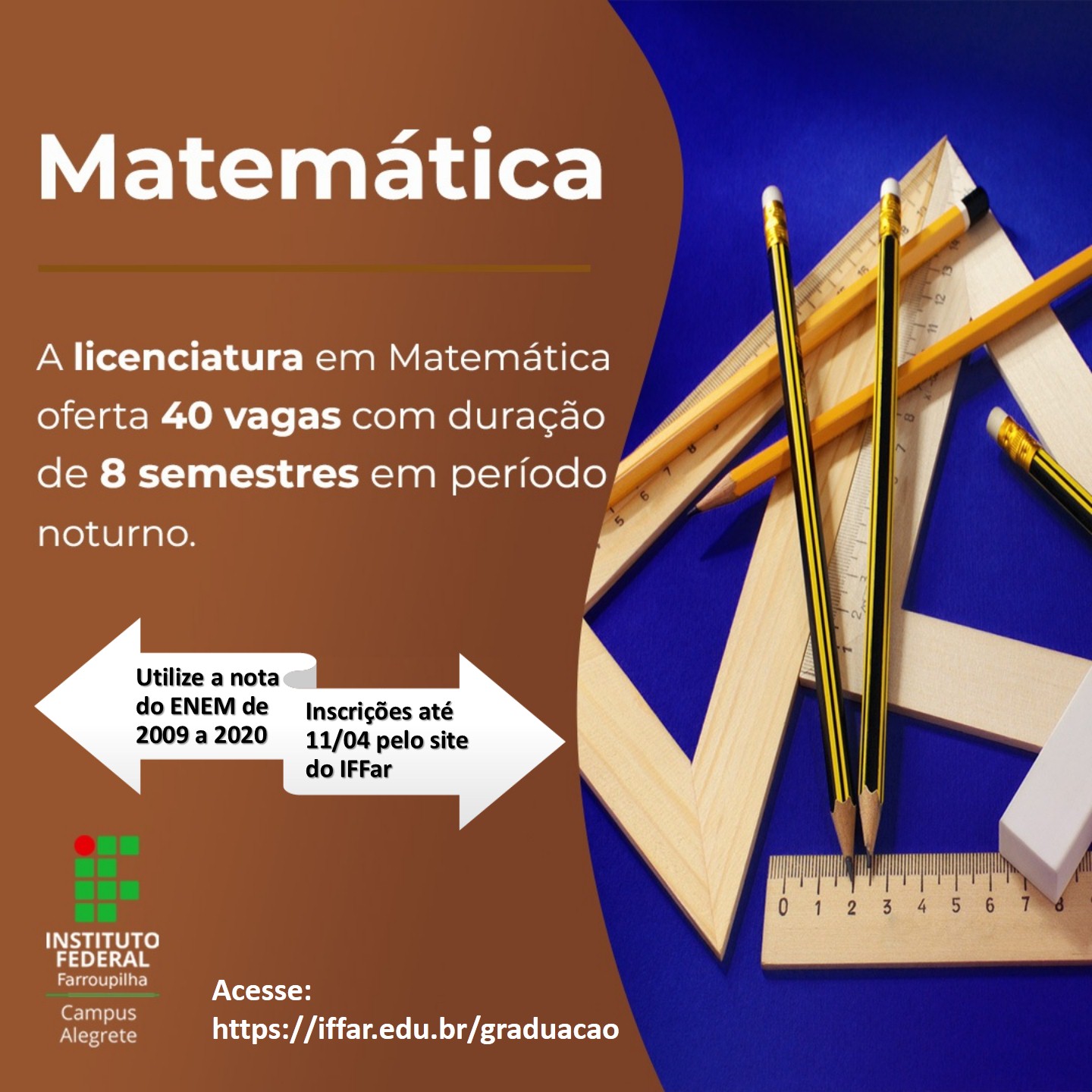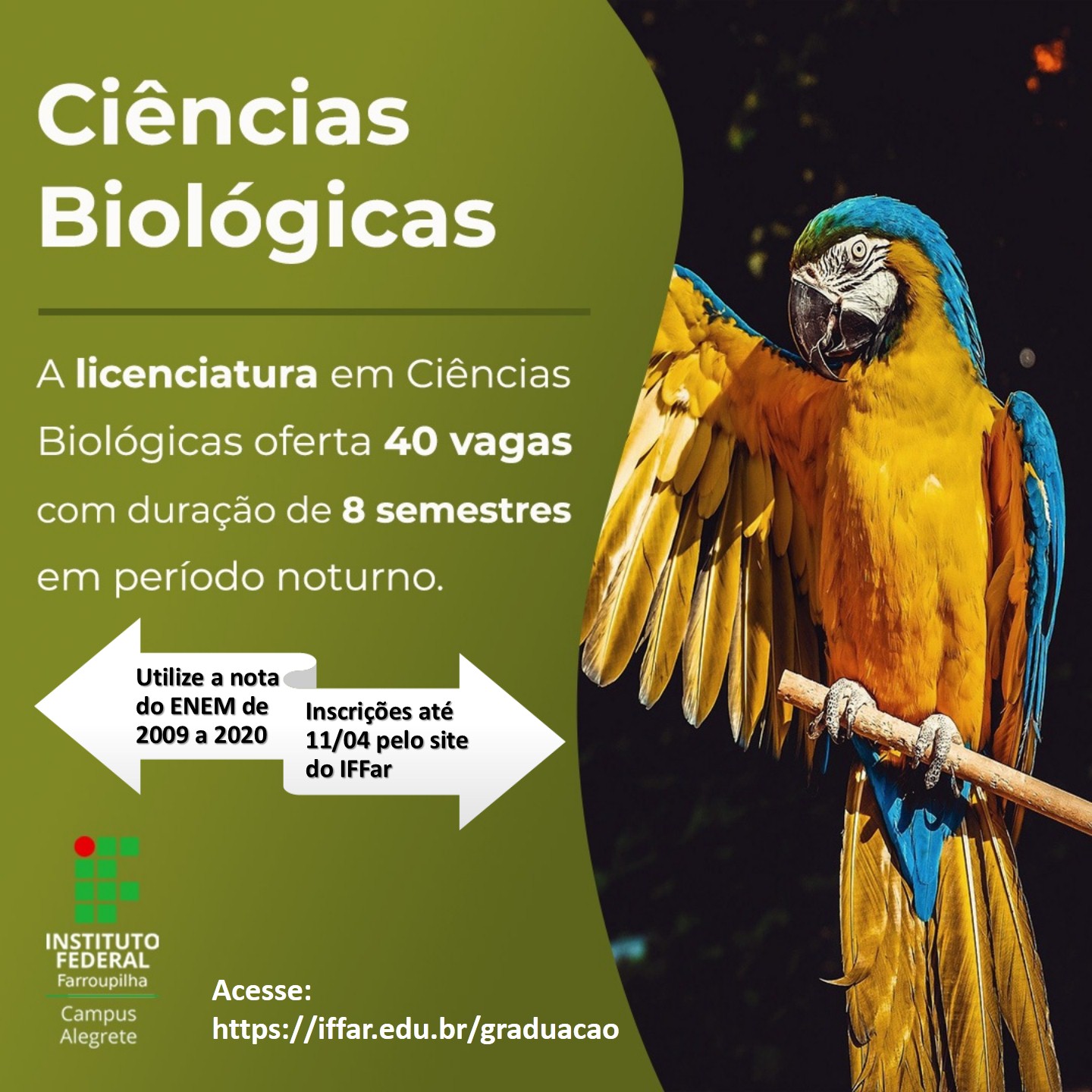 O IFFar - Campus Alegrete está com inscrições abertas para os cursos superiores. O processo seletivo é regido pelo edital nº 077/2021, publicado no dia 29/03. As inscrições são gratuitas e vão até o dia 11 de abril.