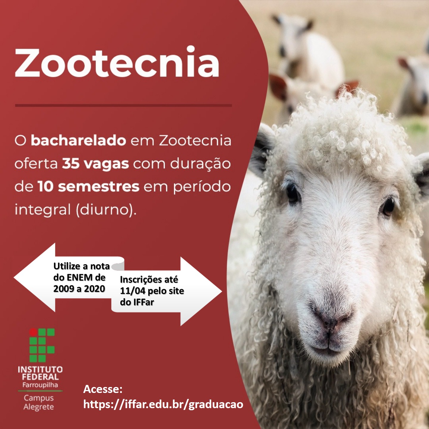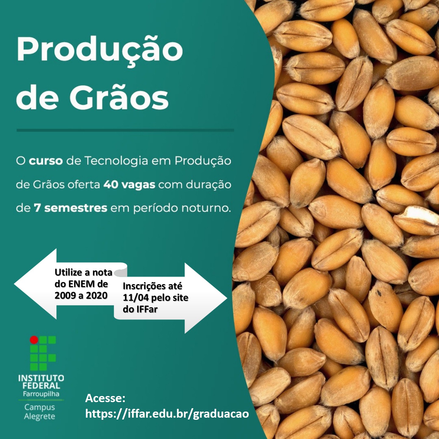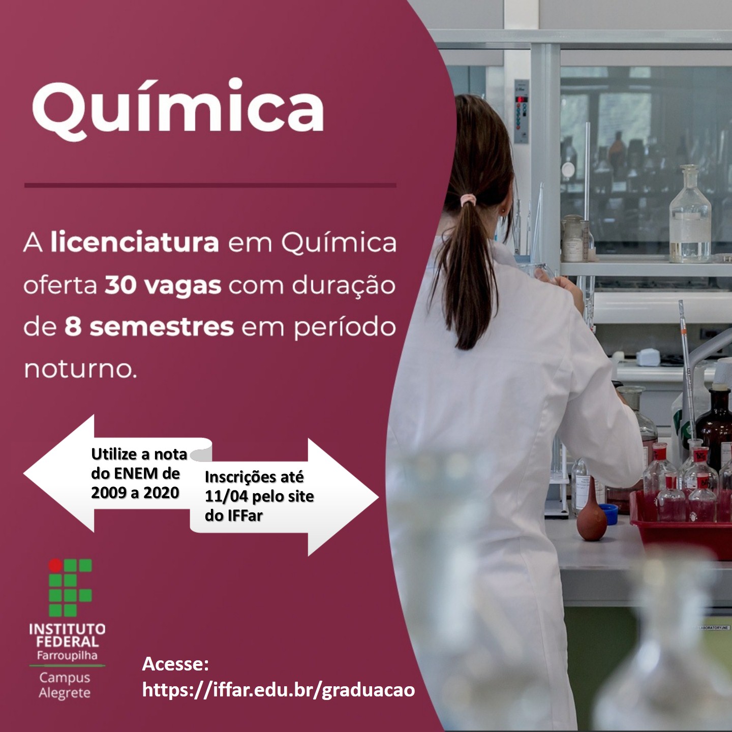 O IFFar - Campus Alegrete está com inscrições abertas para os cursos superiores. O processo seletivo é regido pelo edital nº 077/2021, publicado no dia 29/03. As inscrições são gratuitas e vão até o dia 11 de abril.