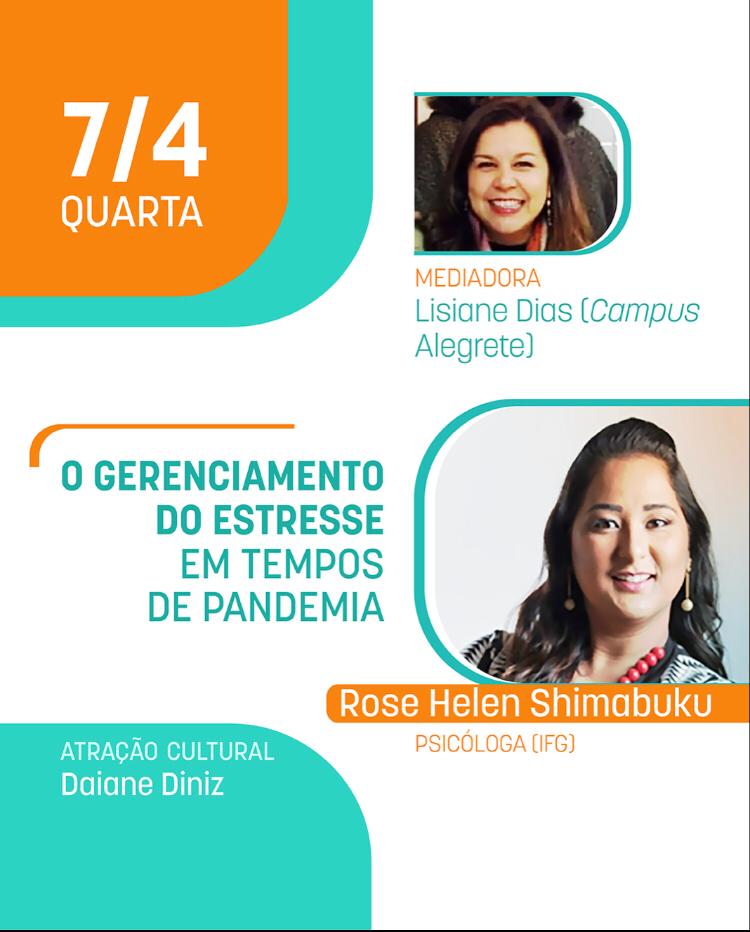 No dia 07 de abril, às 19h, haverá uma fala da Reitora do IFFar, Nídia Heringer. Em seguida, haverá uma atração cultural com a cantora Daiane Diniz e uma homenagem à cantora Deborah Rosa. O tema da palestra neste dia será "O gerenciamento do estresse em tempos de pandemia". A convidada é a psicóloga do Instituto Federal de Goiás (IFG), Rose Helen Shimabuku. A mediadora será a servidora Lisiane Dias do Campus Alegrete.