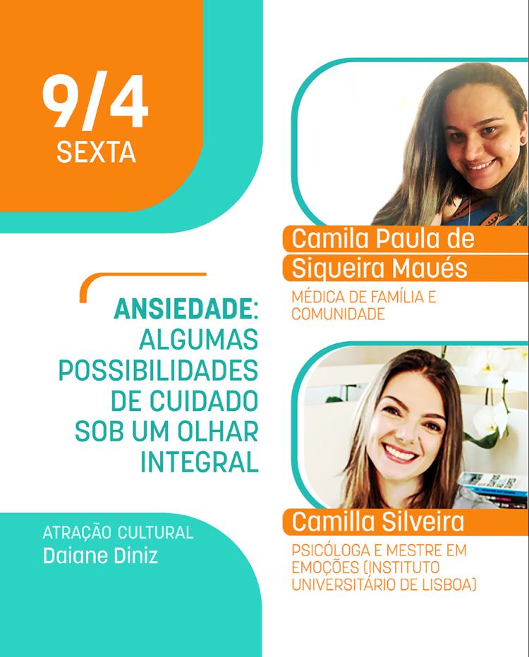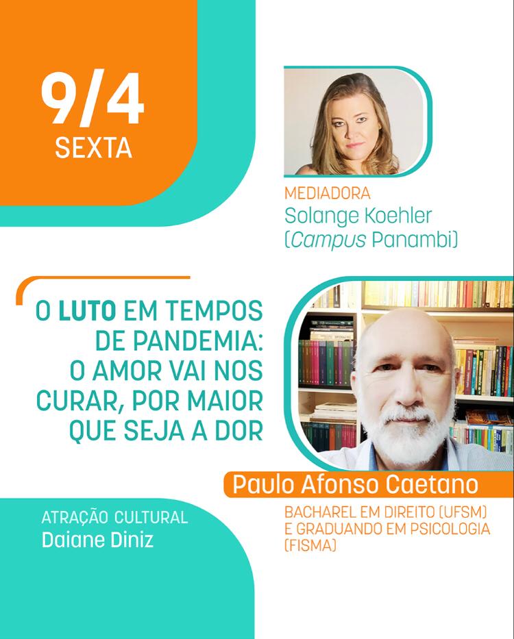 No dia 09 de abril, às 19h, a atração cultural será feita, mais uma vez, pela cantora Daiane Diniz. A primeira palestra, com o tema "O luto em tempos de pandemia: o amor vai nos curar, por maior que seja a dor", será feita por Paulo Afonso Caetano, bacharel em Direito e graduando em Psicologia. A mediação ficará por conta da servidora do Campus Panambi, Solange Koehler. A segunda palestra do dia será sobre "Ansiedade: algumas possibilidades de cuidado sob um olhar integral". As convidadas são Camila Paula de Siqueira Maués, médica de Família e Comunidade, e Camilla Silveira, psicóloga e Mestre em Emoções (Instituto Universitário de Lisboa).