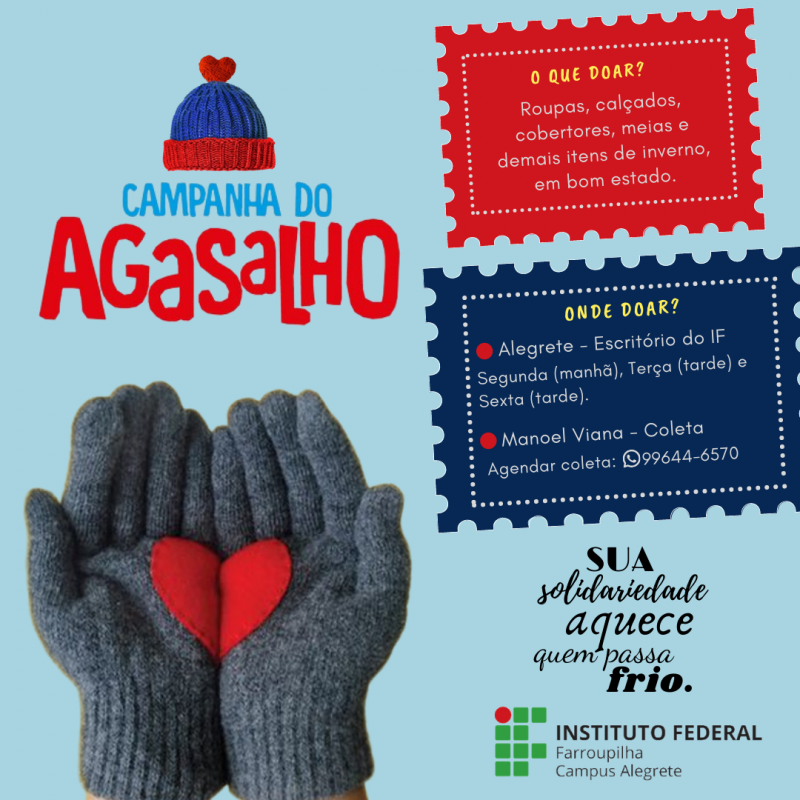 O IFFar - Campus Alegrete lança hoje, 14, a sua Campanha do Agasalho 2021. A Campanha do Agasalho é uma das ações da Direção Geral junto à Coordenação de Assistência Estudantil do Campus.